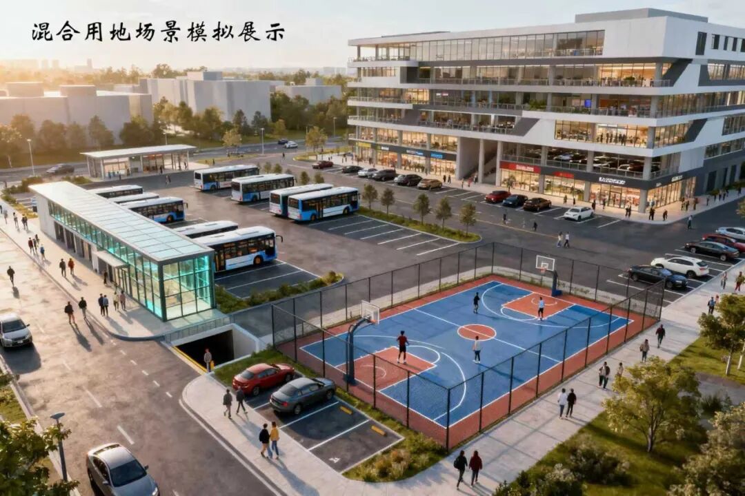 为满足片区综合服务需求,该地块创新采用混合用地模式,突破传统单一功能限制,规划整合停车服务、商业配套、体育健身等多元功能,拟建设公交场站、社会停车场、零售商业、餐饮服务设施及全民健身中心等复合业态,打造集停车、消费、休闲于一体的“一站式城市服务枢纽”。