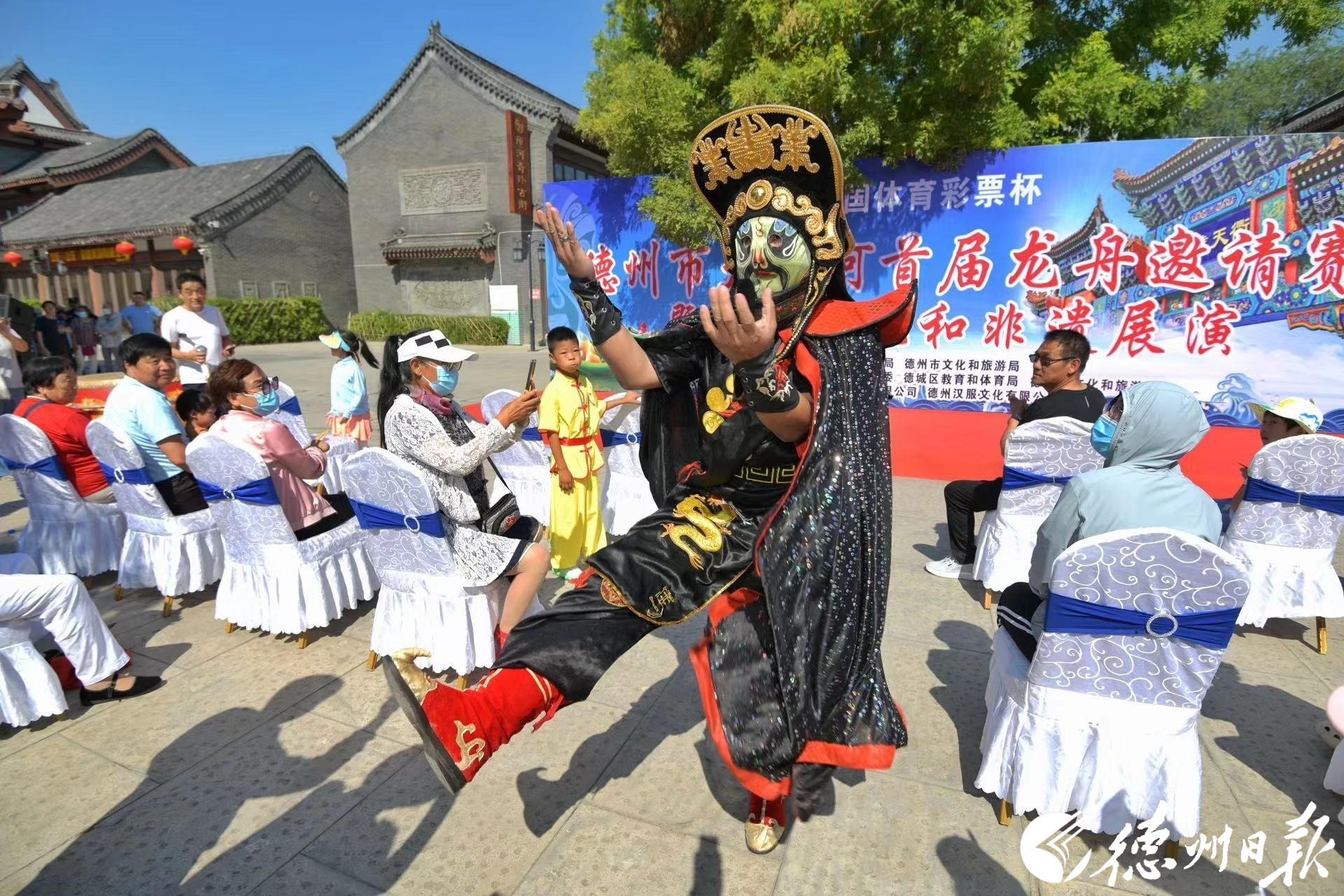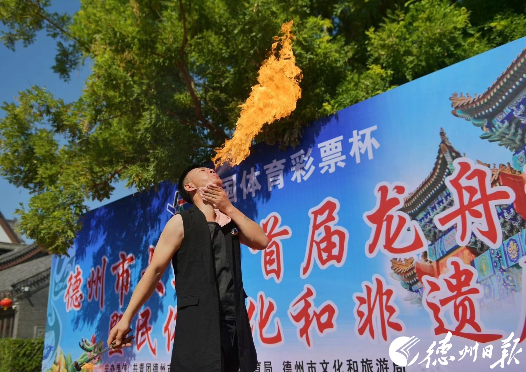 龙舟赛举办期间,德城区还举办了民俗文化和非遗展演活动。该活动在运河古街中心舞台举办,向各界群众集中展示了非遗锣鼓、带桩舞狮、喷火吞剑等我市传统民俗文化。