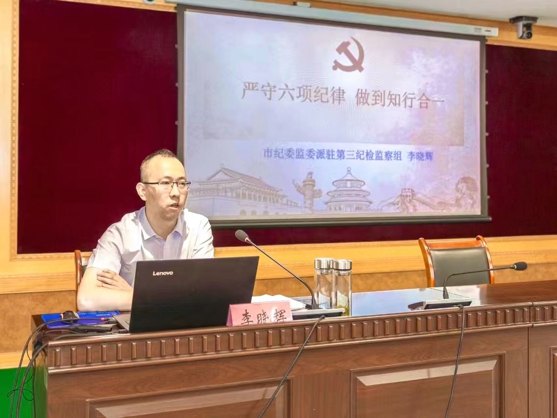 市纪委监委派驻第三纪检监察组四级主任科员李晓辉以《严守六项纪律 做到知行合一》为题进行授课,以鲜活的案例、翔实的数据,阐明了全面加强党的纪律建设的重要意义,划出了党组织和党员不可触碰的底线,对如何全面准确深刻理解和把握六项纪律要求、严守六项纪律、做优秀共产党员进行了深入浅出的解读。