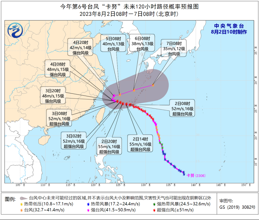 预计“卡努”将以每小时10-15公里的速度向西偏北方向移动,强度变化不大,并向浙江中部至福建北部一带沿海靠近。3日夜间至4日上午,在浙江南部近海转向东北方向移动,远离中国大陆,趋向日本南部洋面,强度逐渐减弱,对我市基本无影响。