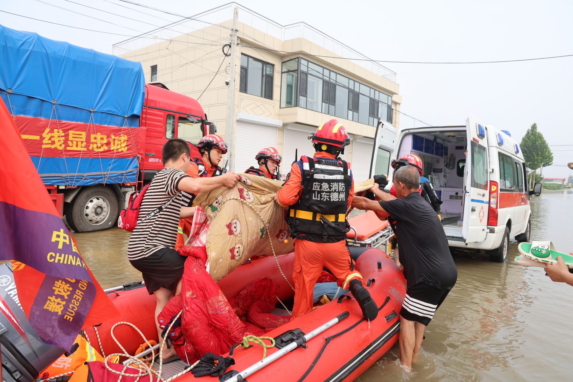 “保定市高碑店市新城镇达子营村有3名村民被困,其中1名老人行动不便,请立即前去营救!”8月4日8时,山东省消防救援总队跨区域增援队德州分队接到指令后,迅速出动4部消防车、16名指战员执行营救任务。