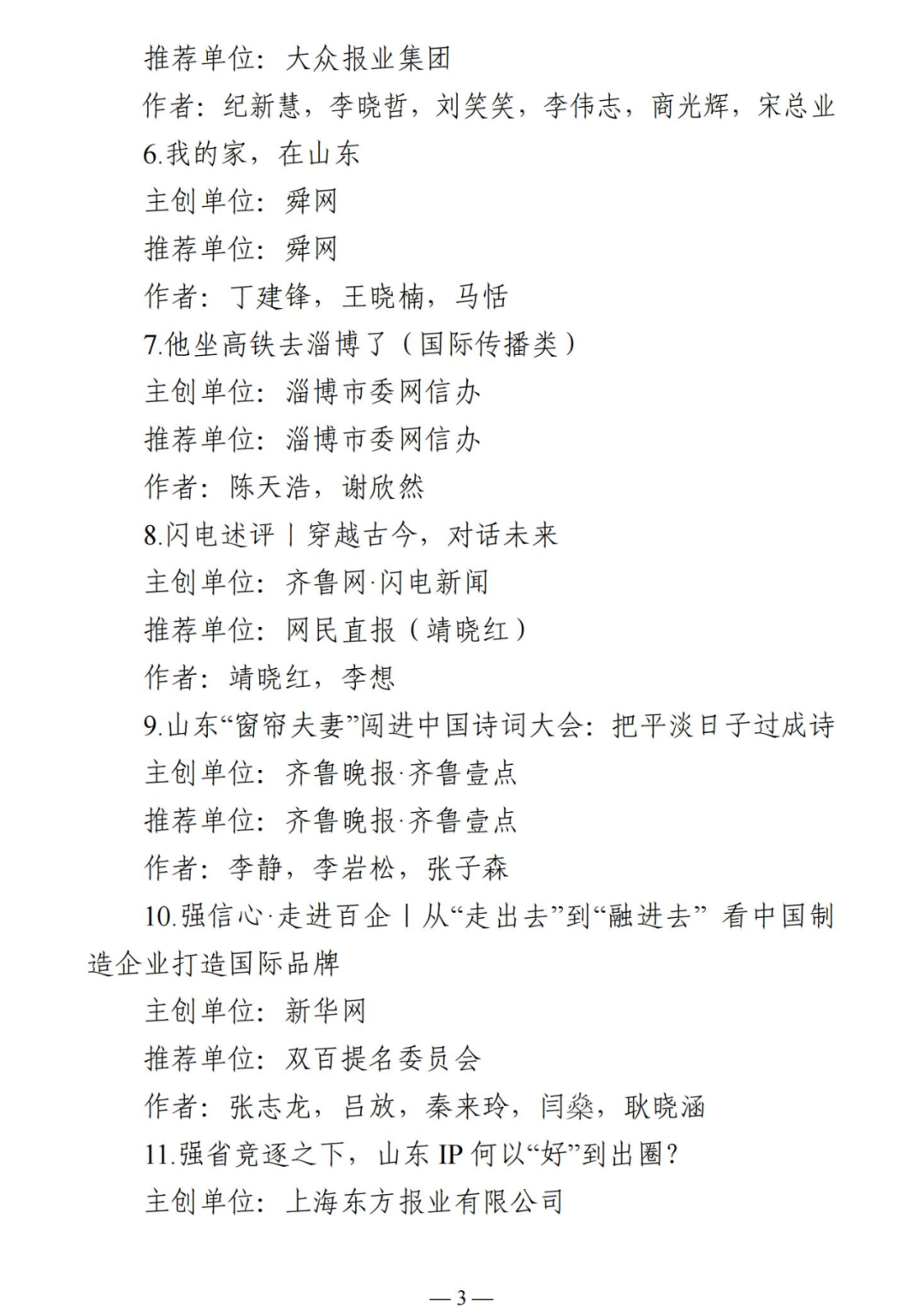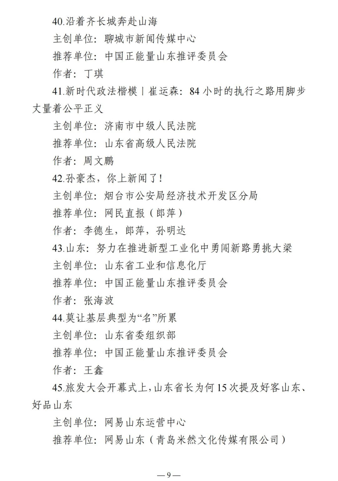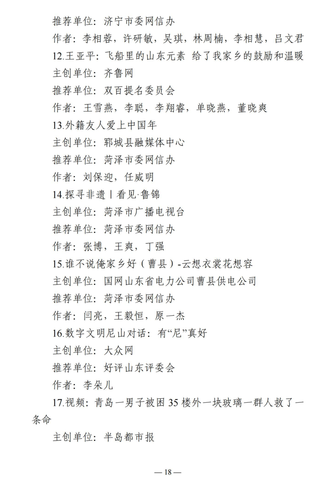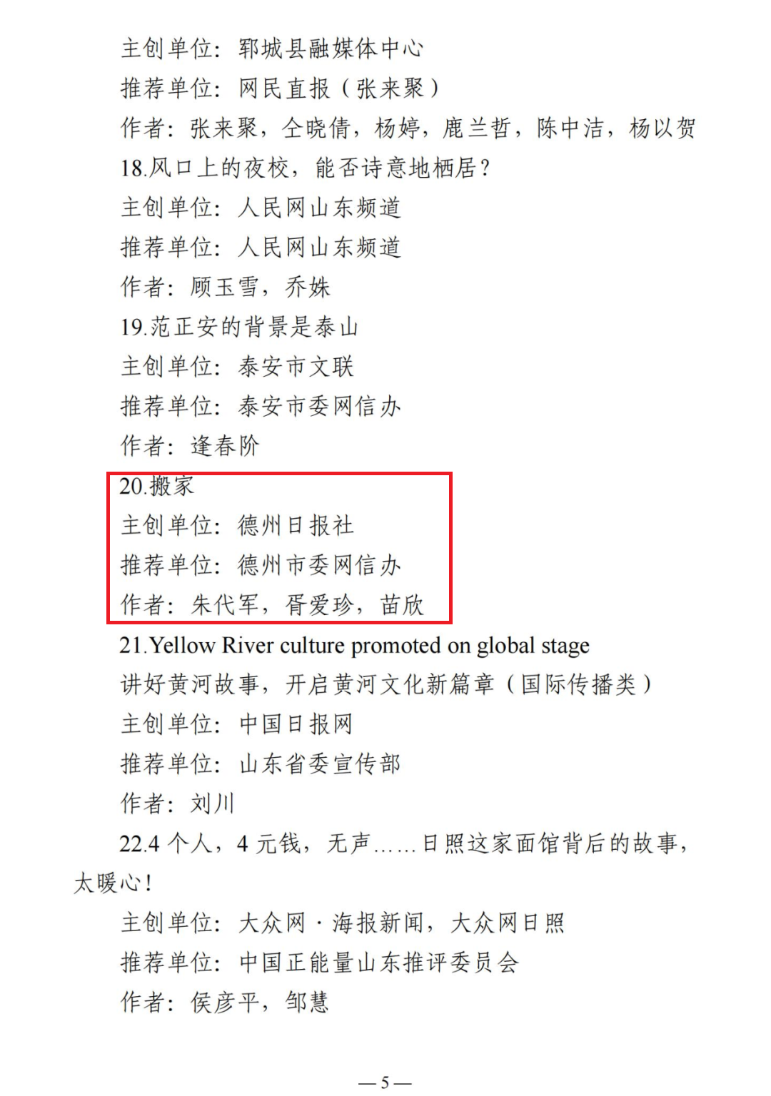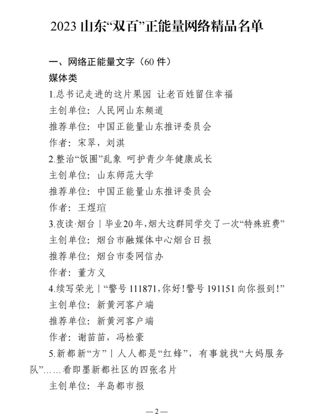 德报1件作品入选!2023山东“双百”正能量网络精品评选活动获奖名单发布 2024-07-29 11:38 网信山东 0 7月29日,第四届山东网络文明周暨2024山东网络文明盛典在德州市拉开帷幕。 活动现场,2023山东“双百”正能量网络精品评选活动入选精品名单正式公布,100件媒体类和100件融合类正能量网络精品入选,其中网络正能量文字60件,网络正能量图片20件,网络正能量音视频80件,网络正能量专题专栏20件,网络正能量主题活动20件。其中,德报报告文学作品《搬家》入选网络正能量文字精品名单。 点击图片查看原文 获奖作品名单如下: 德州日报新媒体出品来源|网信山东 编辑|苗欣审核|张晓航 终审|朱代军