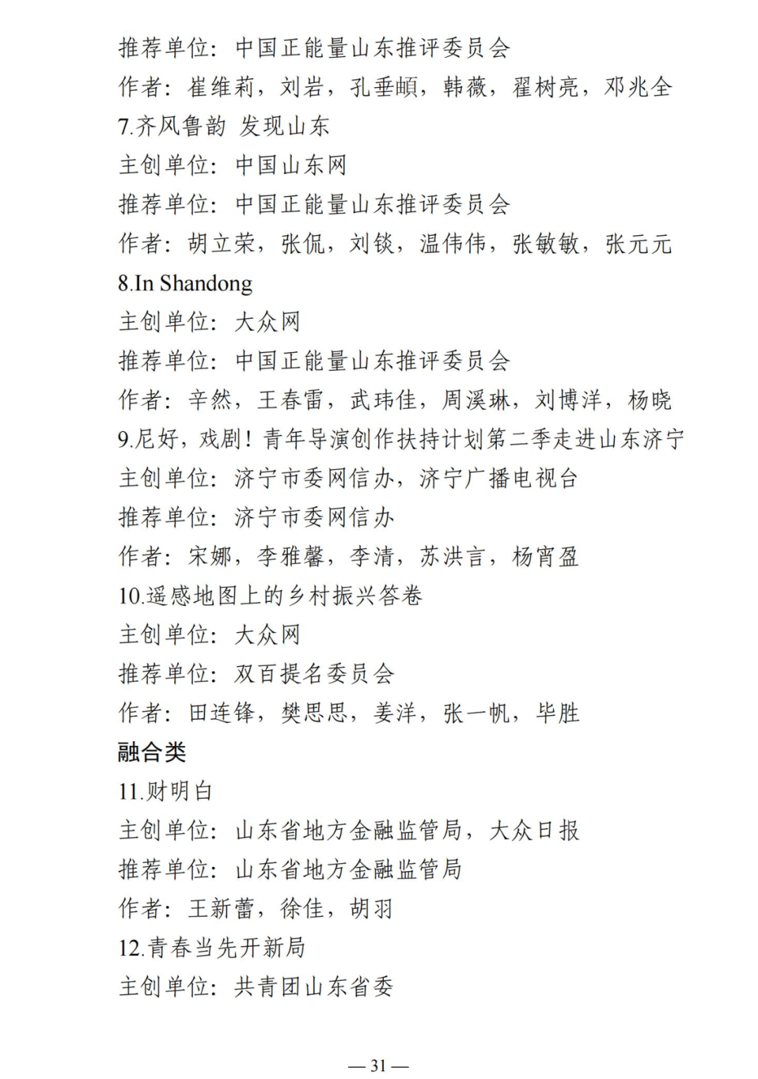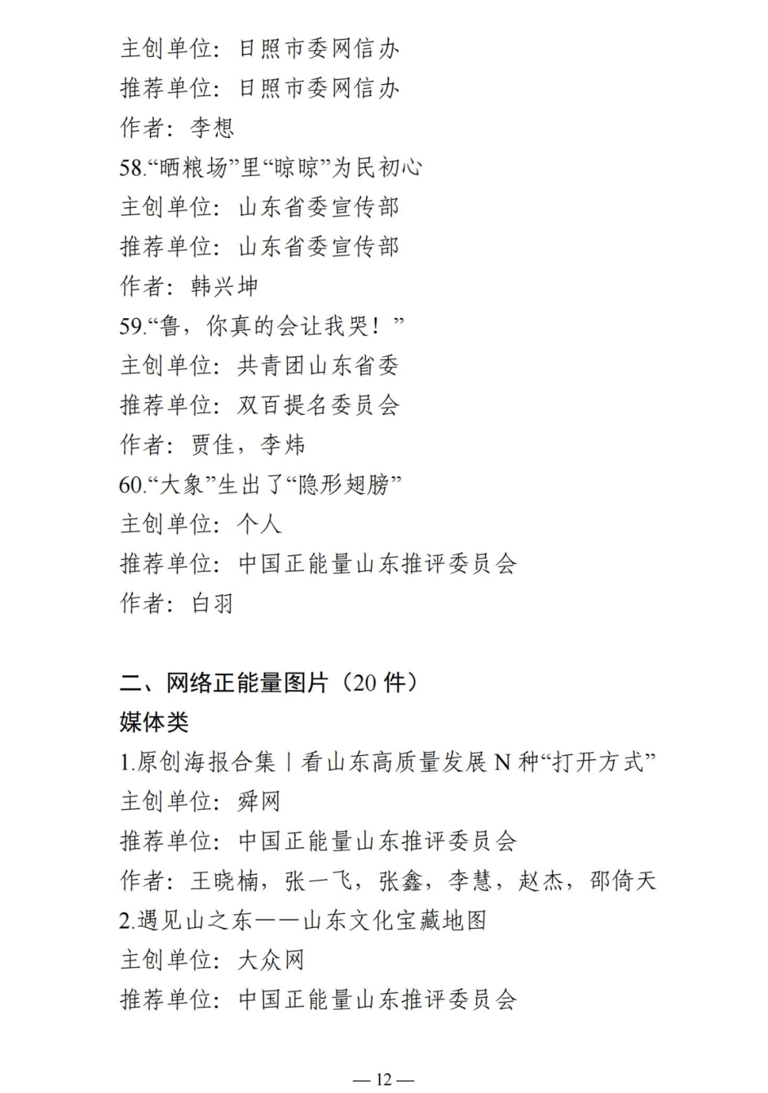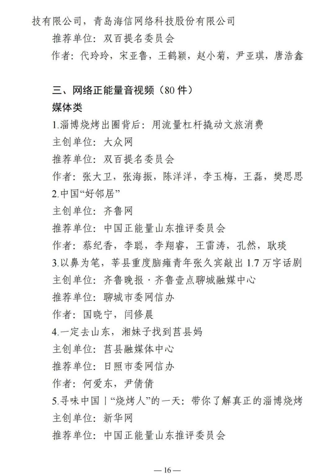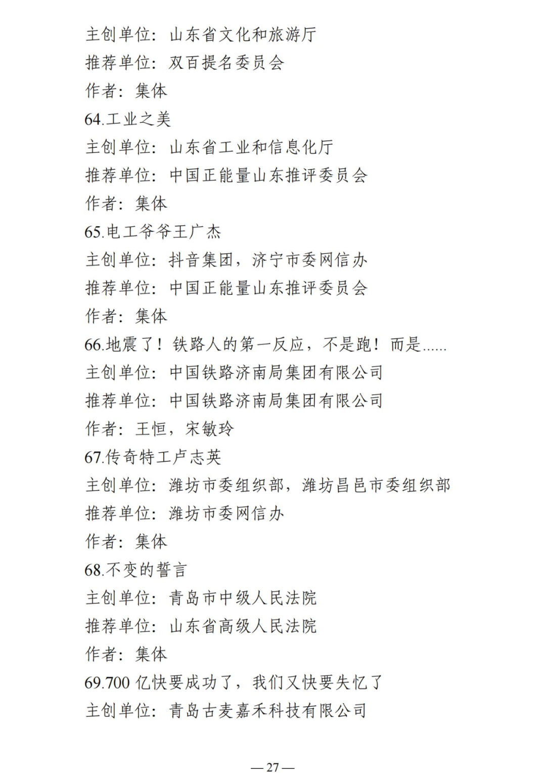 德报1件作品入选!2023山东“双百”正能量网络精品评选活动获奖名单发布 2024-07-29 11:38 网信山东 0 7月29日,第四届山东网络文明周暨2024山东网络文明盛典在德州市拉开帷幕。 活动现场,2023山东“双百”正能量网络精品评选活动入选精品名单正式公布,100件媒体类和100件融合类正能量网络精品入选,其中网络正能量文字60件,网络正能量图片20件,网络正能量音视频80件,网络正能量专题专栏20件,网络正能量主题活动20件。其中,德报报告文学作品《搬家》入选网络正能量文字精品名单。 点击图片查看原文 获奖作品名单如下: 德州日报新媒体出品来源|网信山东 编辑|苗欣审核|张晓航 终审|朱代军