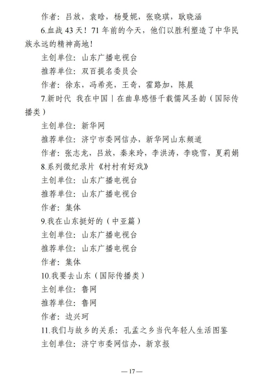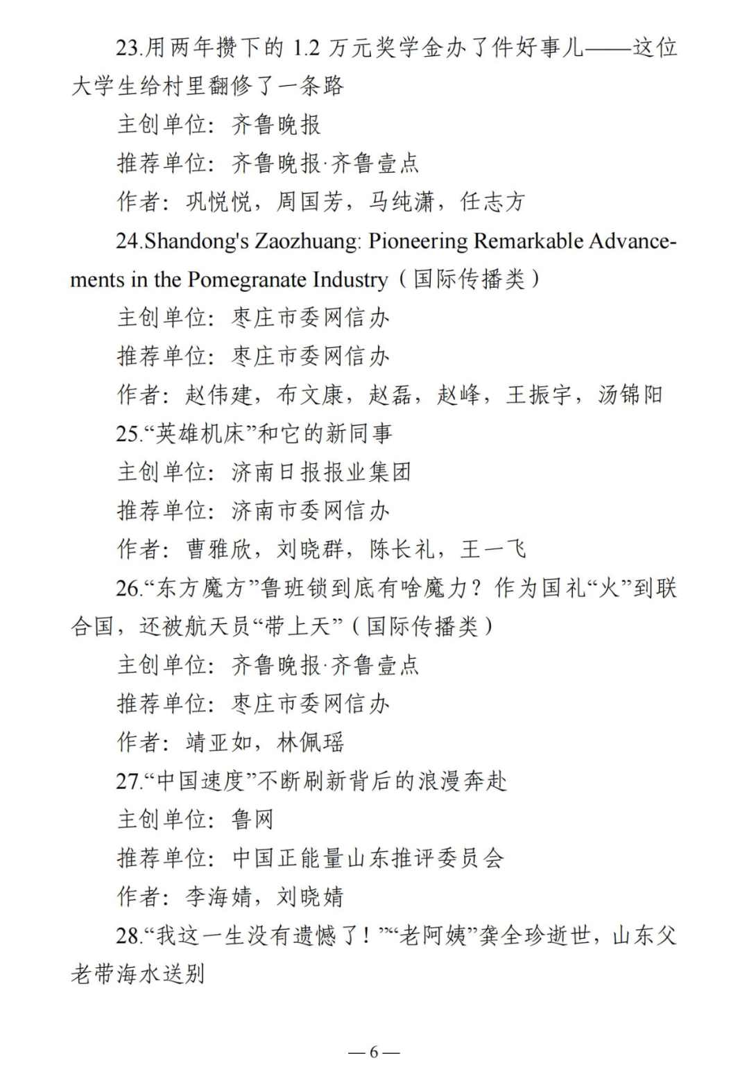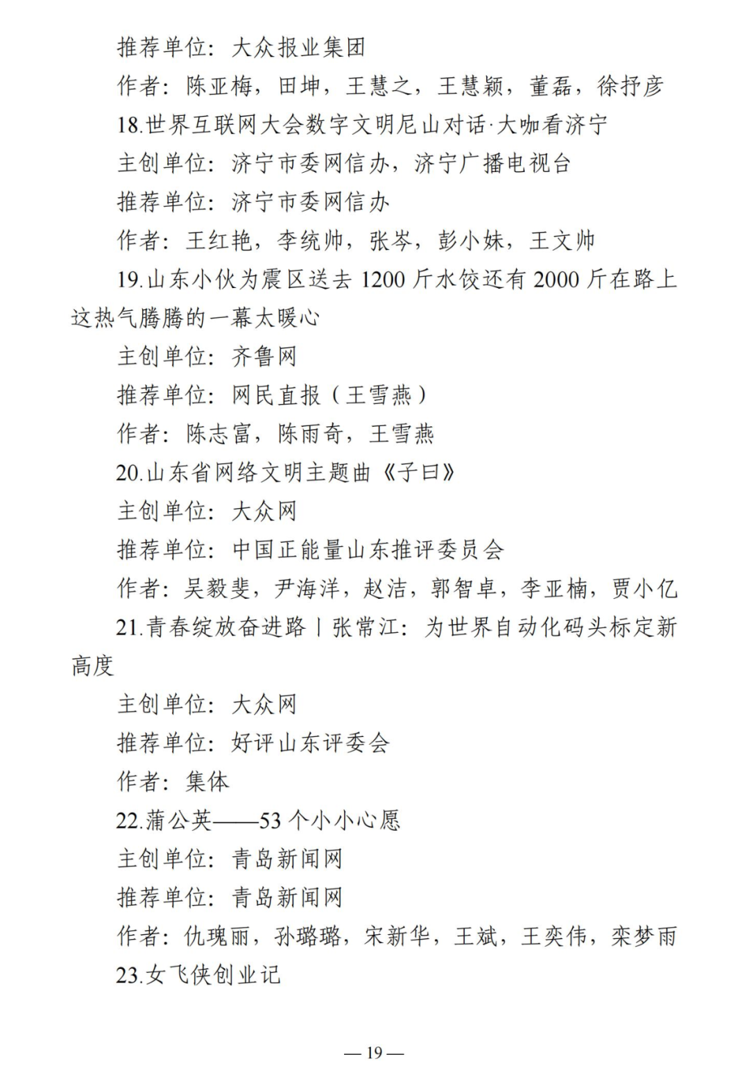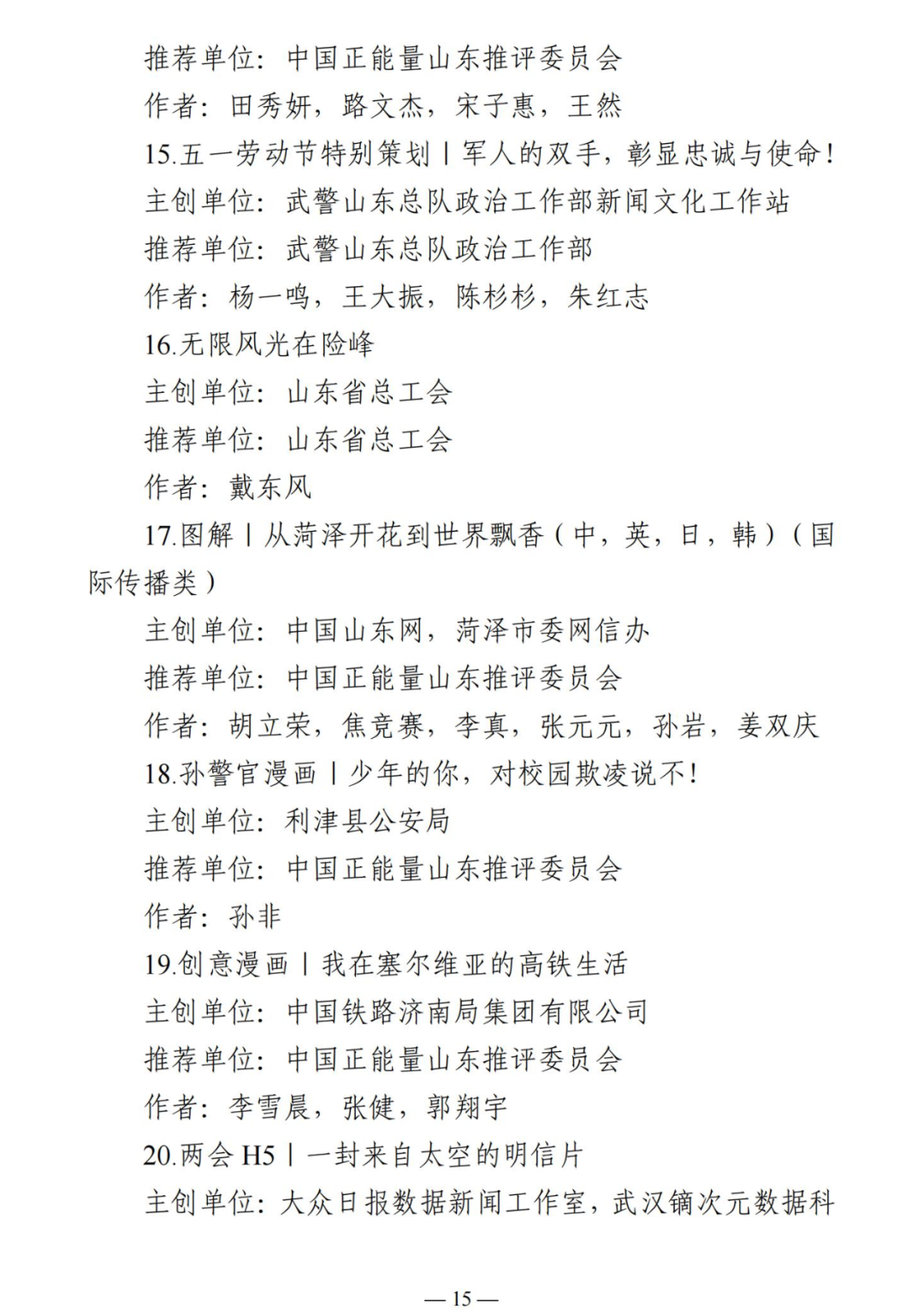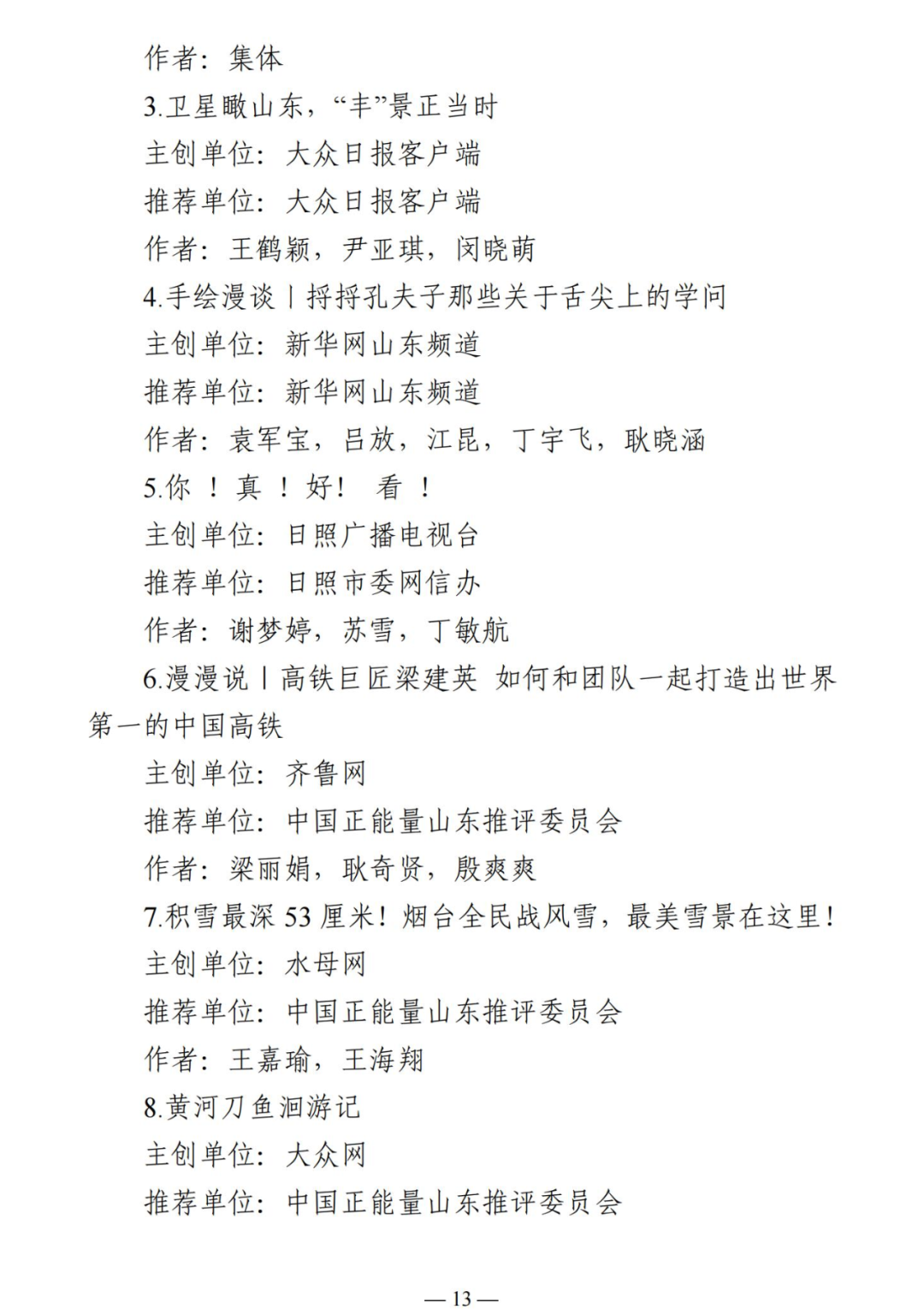德报1件作品入选!2023山东“双百”正能量网络精品评选活动获奖名单发布 2024-07-29 11:38 网信山东 0 7月29日,第四届山东网络文明周暨2024山东网络文明盛典在德州市拉开帷幕。 活动现场,2023山东“双百”正能量网络精品评选活动入选精品名单正式公布,100件媒体类和100件融合类正能量网络精品入选,其中网络正能量文字60件,网络正能量图片20件,网络正能量音视频80件,网络正能量专题专栏20件,网络正能量主题活动20件。其中,德报报告文学作品《搬家》入选网络正能量文字精品名单。 点击图片查看原文 获奖作品名单如下: 德州日报新媒体出品来源|网信山东 编辑|苗欣审核|张晓航 终审|朱代军