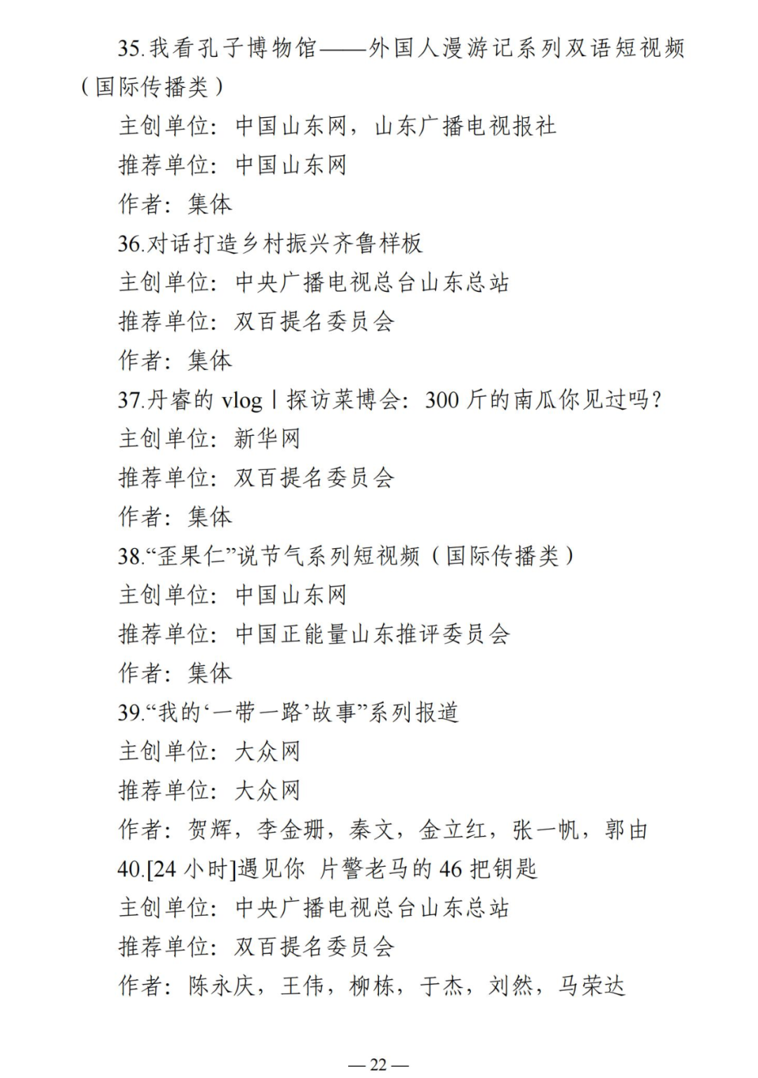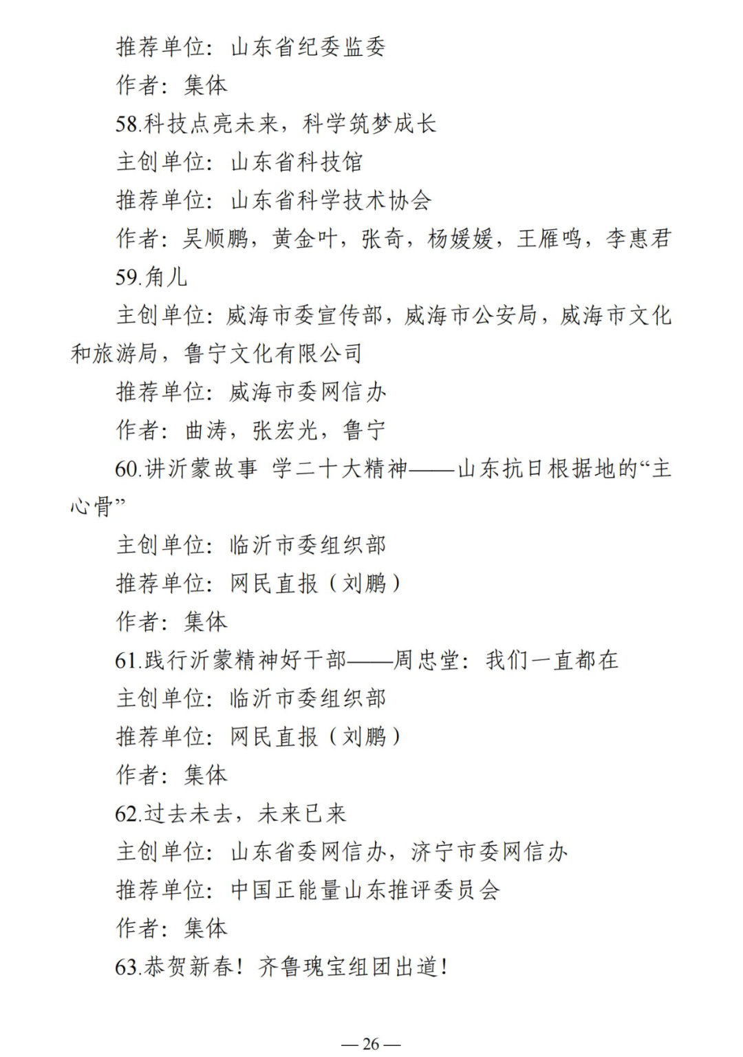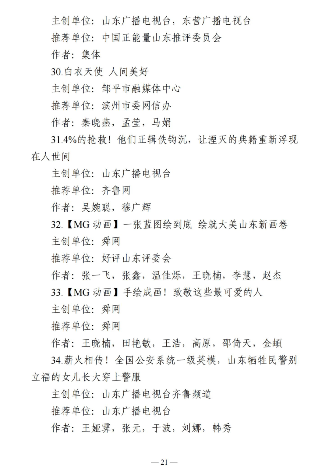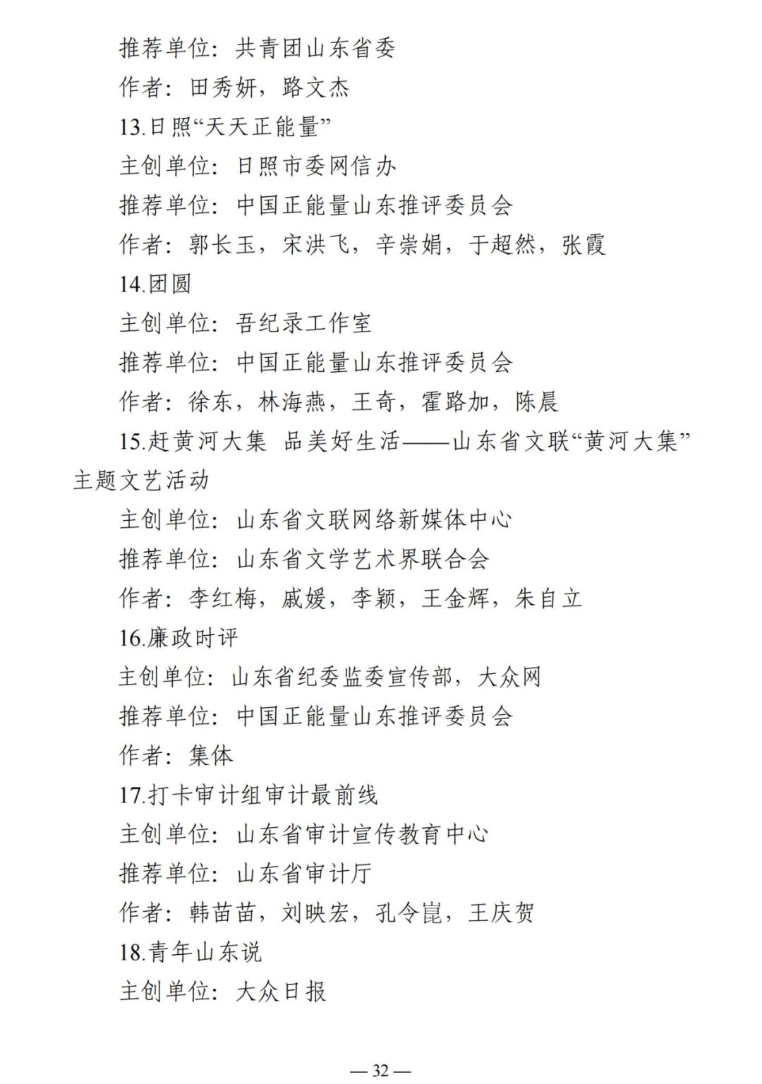 德报1件作品入选!2023山东“双百”正能量网络精品评选活动获奖名单发布 2024-07-29 11:38 网信山东 0 7月29日,第四届山东网络文明周暨2024山东网络文明盛典在德州市拉开帷幕。 活动现场,2023山东“双百”正能量网络精品评选活动入选精品名单正式公布,100件媒体类和100件融合类正能量网络精品入选,其中网络正能量文字60件,网络正能量图片20件,网络正能量音视频80件,网络正能量专题专栏20件,网络正能量主题活动20件。其中,德报报告文学作品《搬家》入选网络正能量文字精品名单。 点击图片查看原文 获奖作品名单如下: 德州日报新媒体出品来源|网信山东 编辑|苗欣审核|张晓航 终审|朱代军