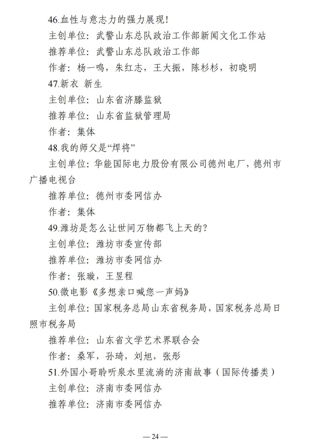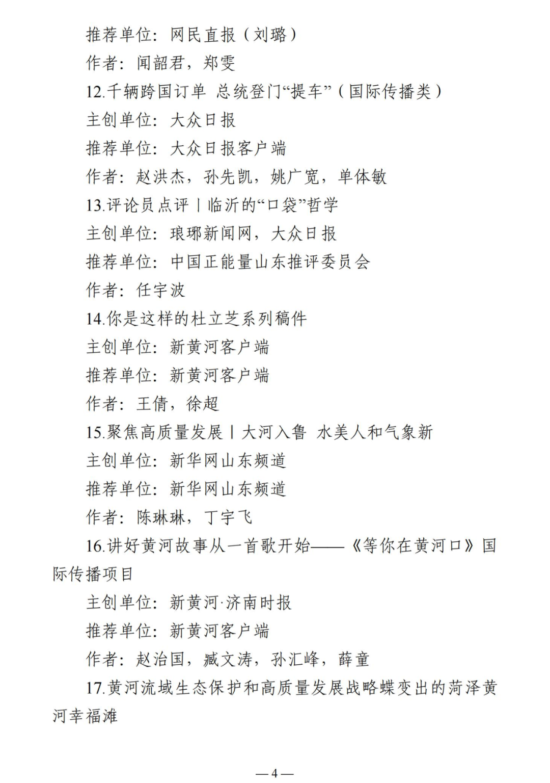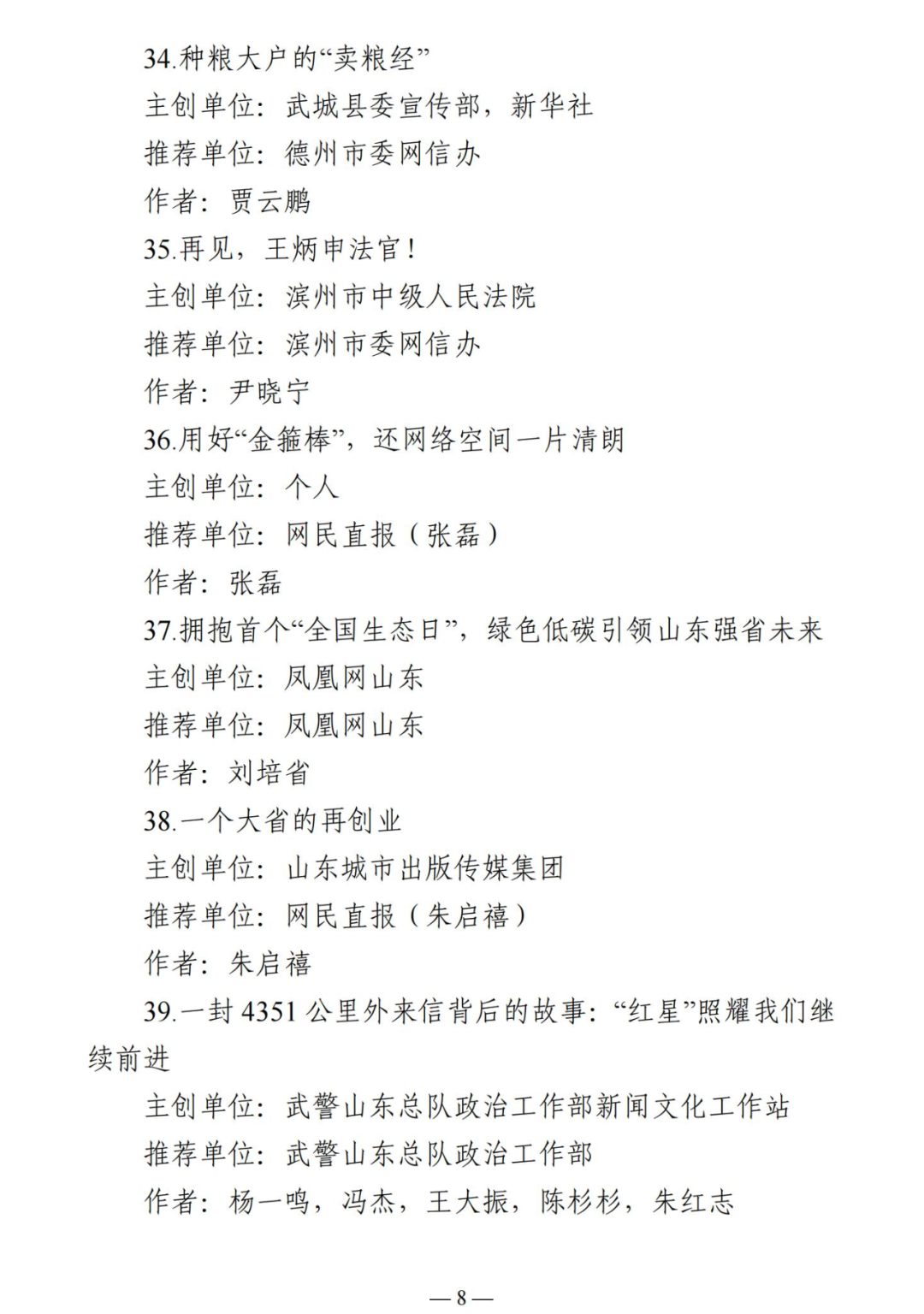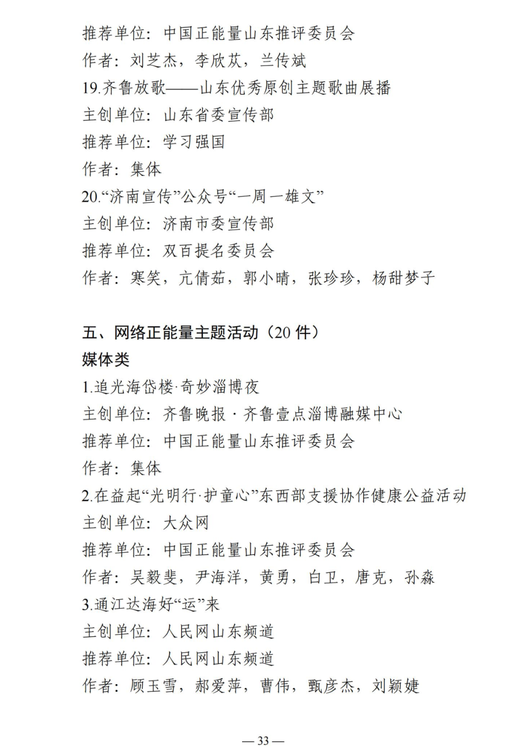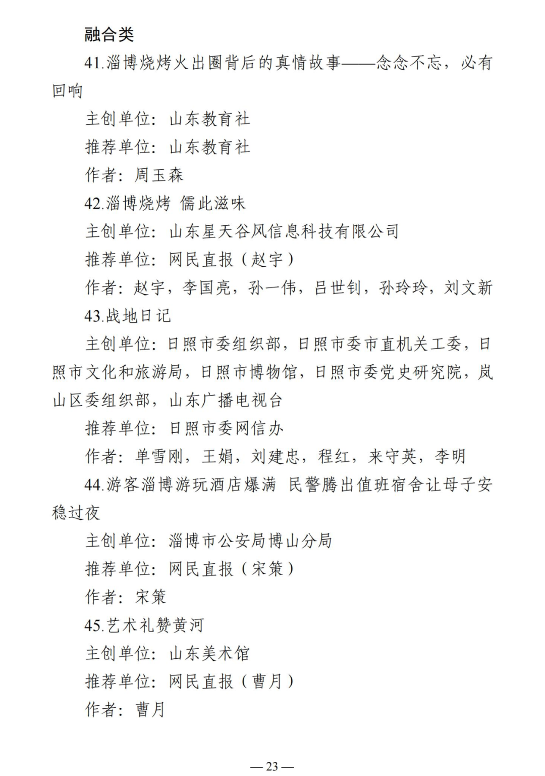 德报1件作品入选!2023山东“双百”正能量网络精品评选活动获奖名单发布 2024-07-29 11:38 网信山东 0 7月29日,第四届山东网络文明周暨2024山东网络文明盛典在德州市拉开帷幕。 活动现场,2023山东“双百”正能量网络精品评选活动入选精品名单正式公布,100件媒体类和100件融合类正能量网络精品入选,其中网络正能量文字60件,网络正能量图片20件,网络正能量音视频80件,网络正能量专题专栏20件,网络正能量主题活动20件。其中,德报报告文学作品《搬家》入选网络正能量文字精品名单。 点击图片查看原文 获奖作品名单如下: 德州日报新媒体出品来源|网信山东 编辑|苗欣审核|张晓航 终审|朱代军