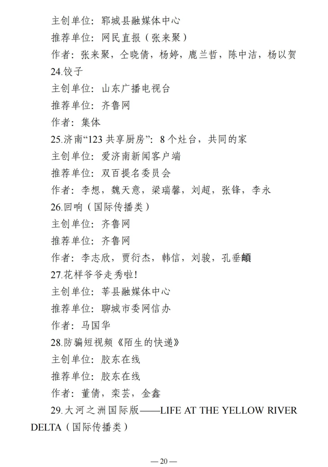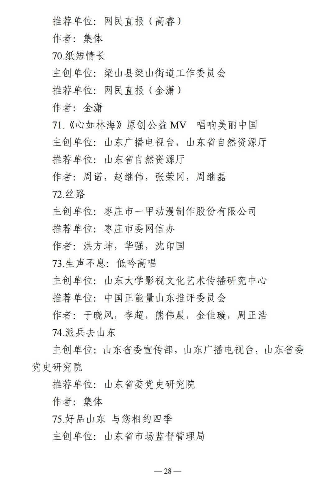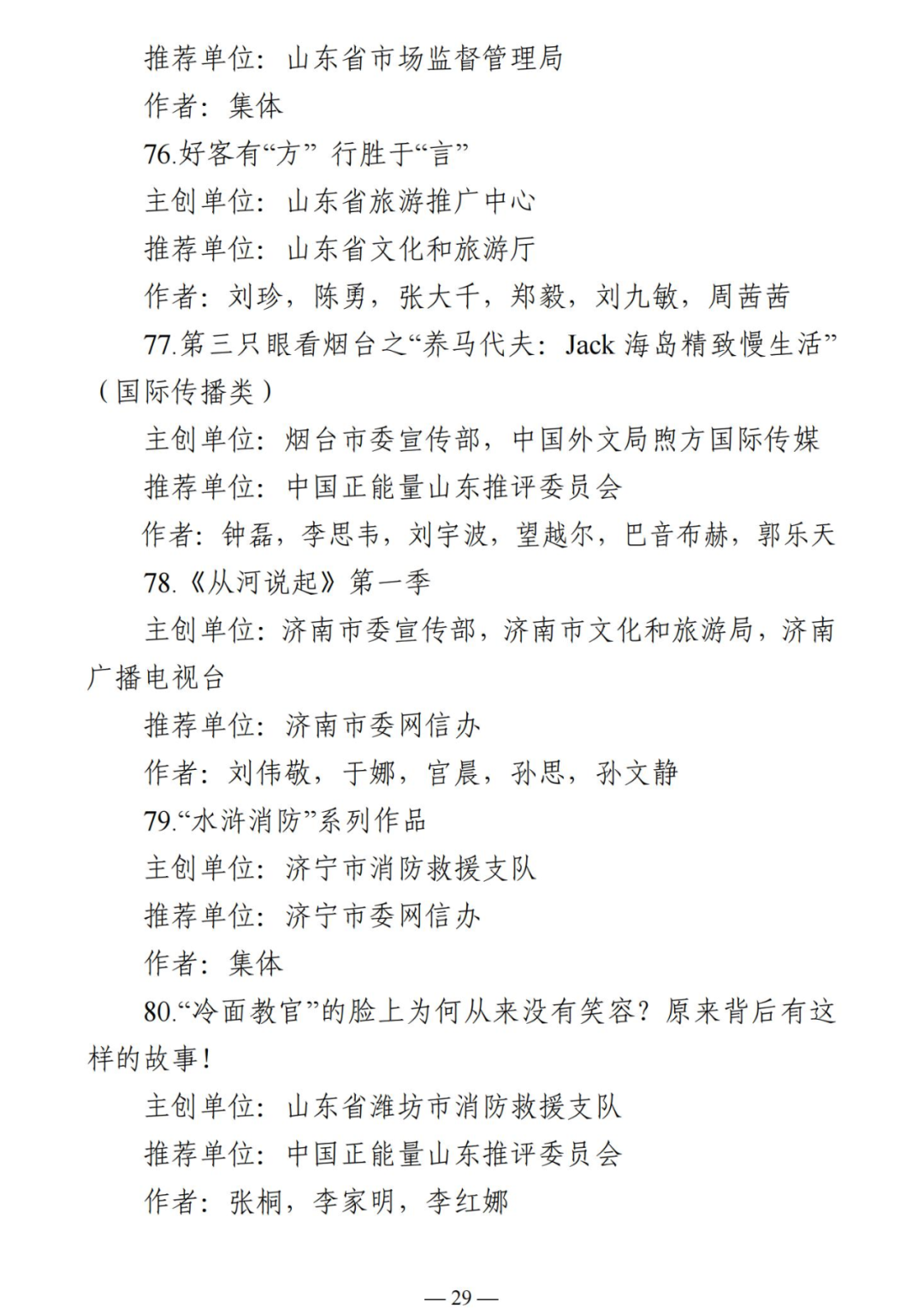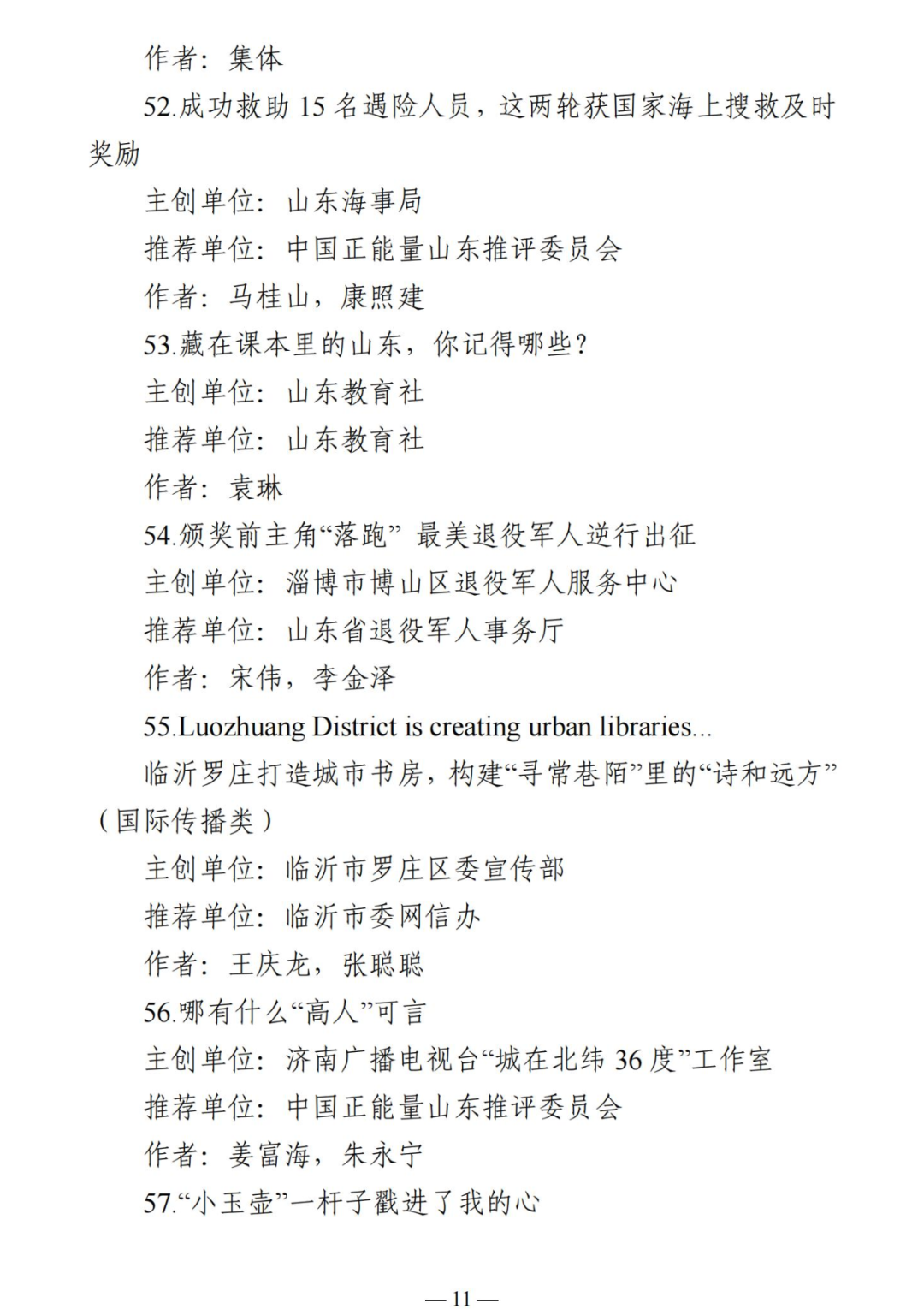 德报1件作品入选!2023山东“双百”正能量网络精品评选活动获奖名单发布 2024-07-29 11:38 网信山东 0 7月29日,第四届山东网络文明周暨2024山东网络文明盛典在德州市拉开帷幕。 活动现场,2023山东“双百”正能量网络精品评选活动入选精品名单正式公布,100件媒体类和100件融合类正能量网络精品入选,其中网络正能量文字60件,网络正能量图片20件,网络正能量音视频80件,网络正能量专题专栏20件,网络正能量主题活动20件。其中,德报报告文学作品《搬家》入选网络正能量文字精品名单。 点击图片查看原文 获奖作品名单如下: 德州日报新媒体出品来源|网信山东 编辑|苗欣审核|张晓航 终审|朱代军