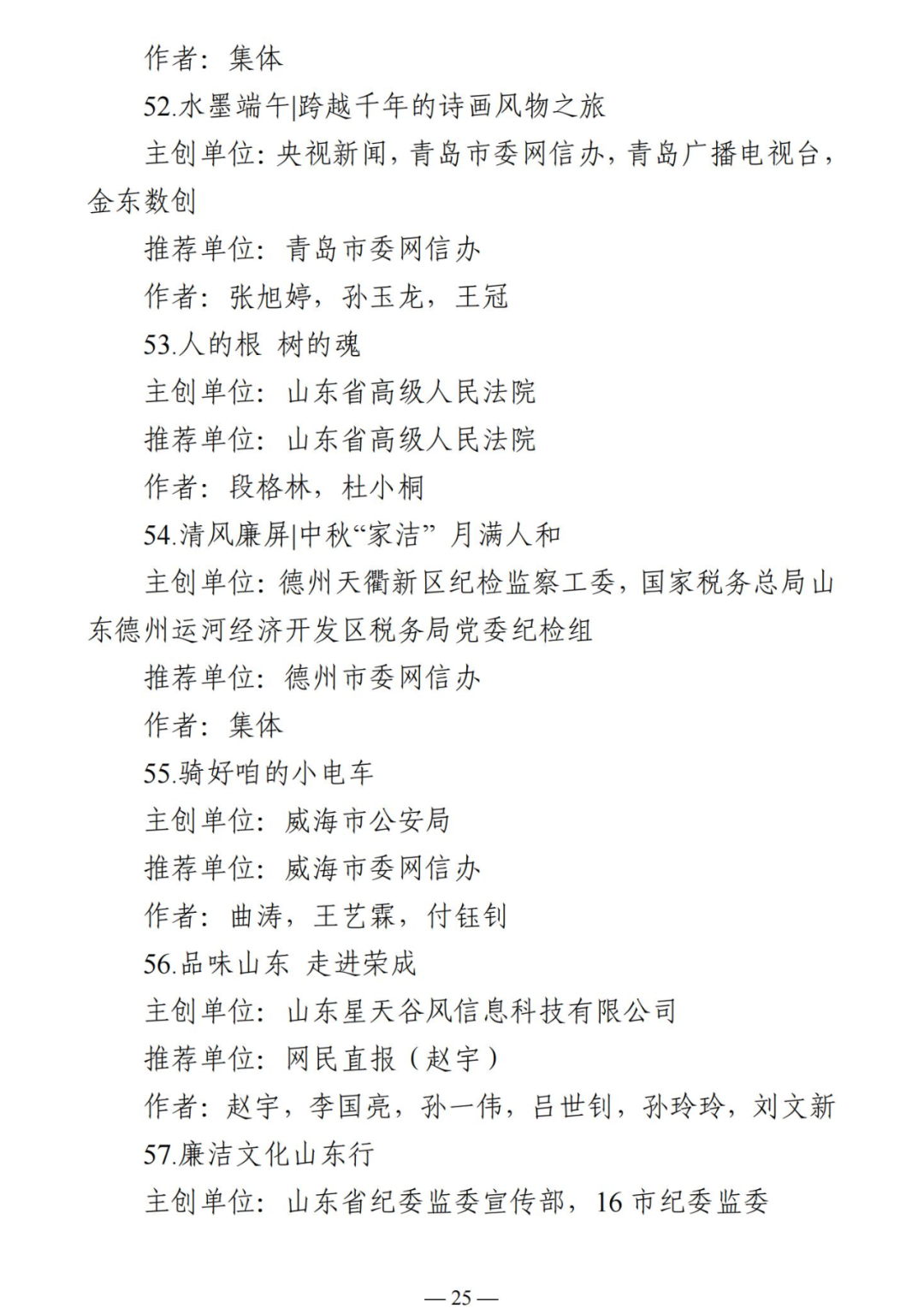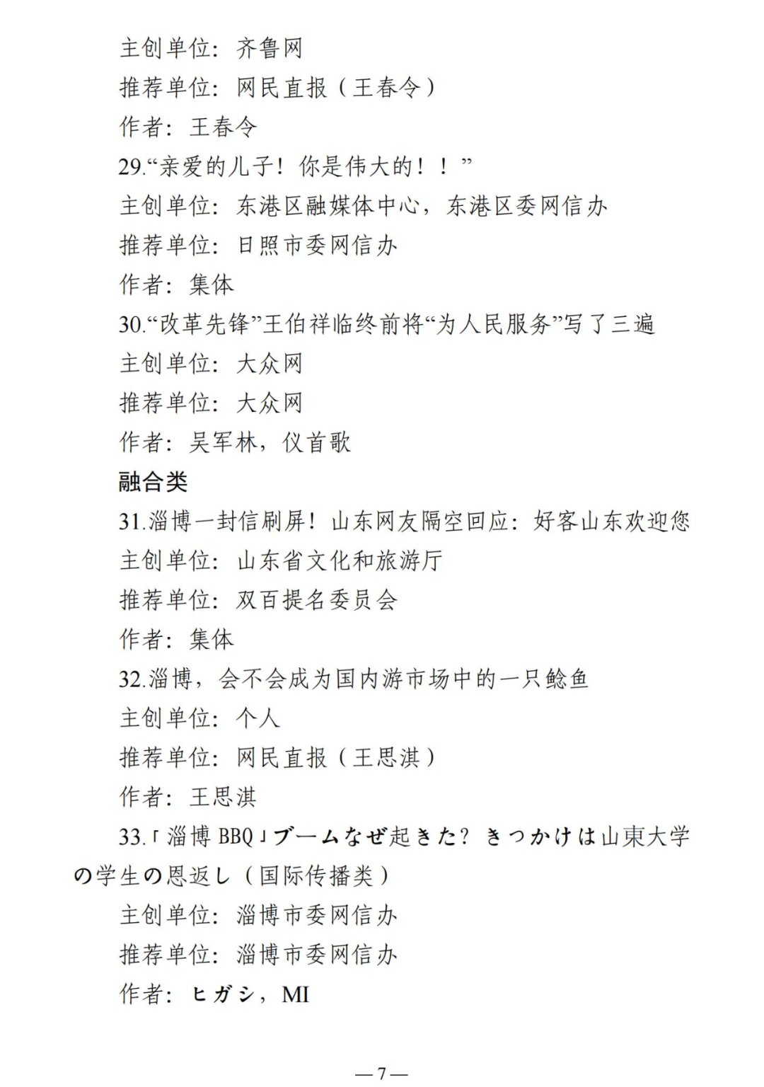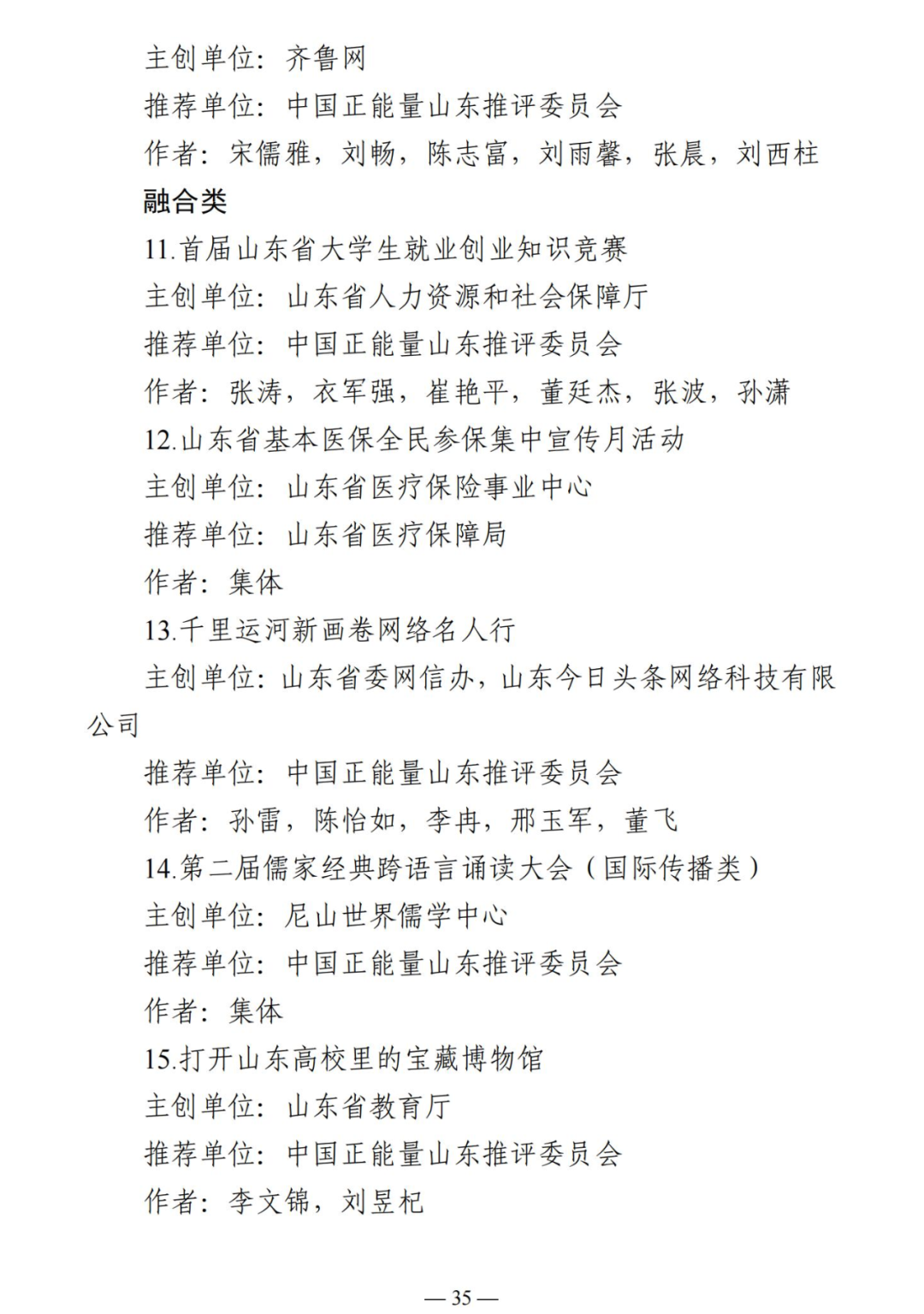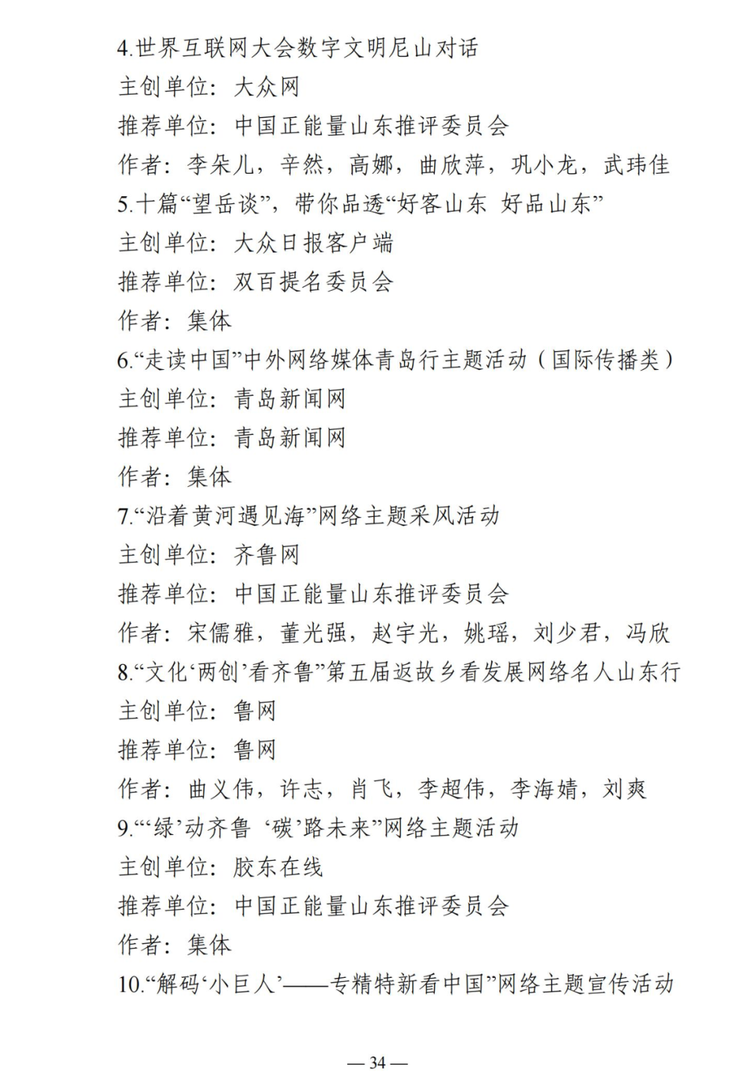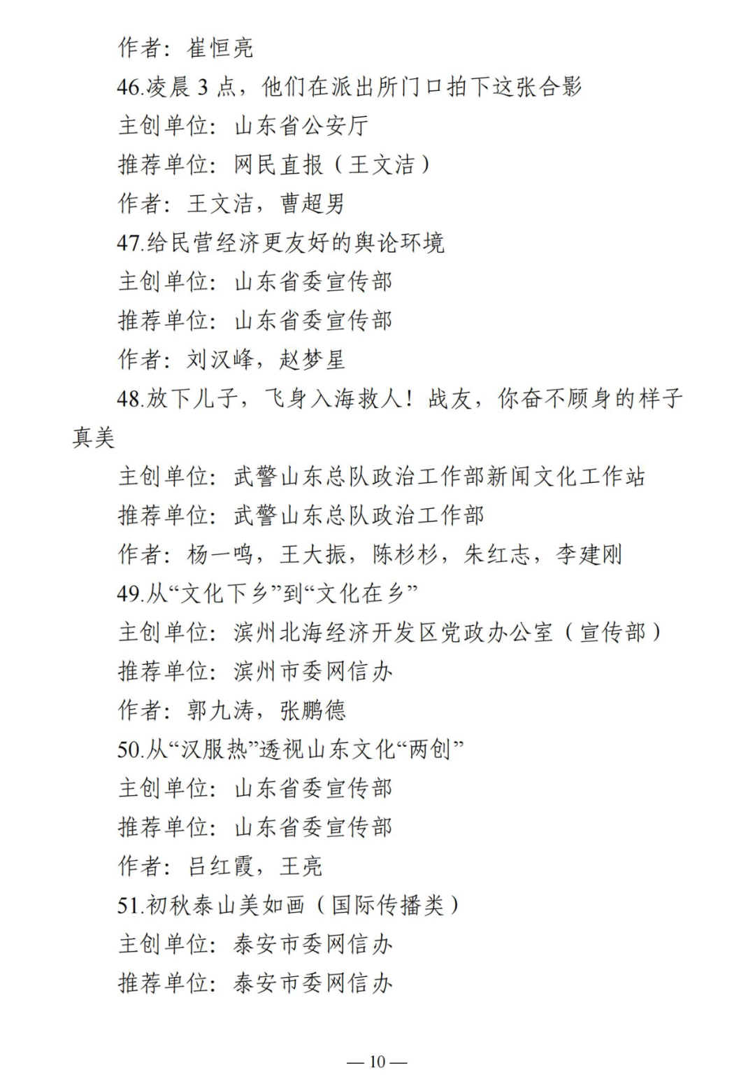 德报1件作品入选!2023山东“双百”正能量网络精品评选活动获奖名单发布 2024-07-29 11:38 网信山东 0 7月29日,第四届山东网络文明周暨2024山东网络文明盛典在德州市拉开帷幕。 活动现场,2023山东“双百”正能量网络精品评选活动入选精品名单正式公布,100件媒体类和100件融合类正能量网络精品入选,其中网络正能量文字60件,网络正能量图片20件,网络正能量音视频80件,网络正能量专题专栏20件,网络正能量主题活动20件。其中,德报报告文学作品《搬家》入选网络正能量文字精品名单。 点击图片查看原文 获奖作品名单如下: 德州日报新媒体出品来源|网信山东 编辑|苗欣审核|张晓航 终审|朱代军