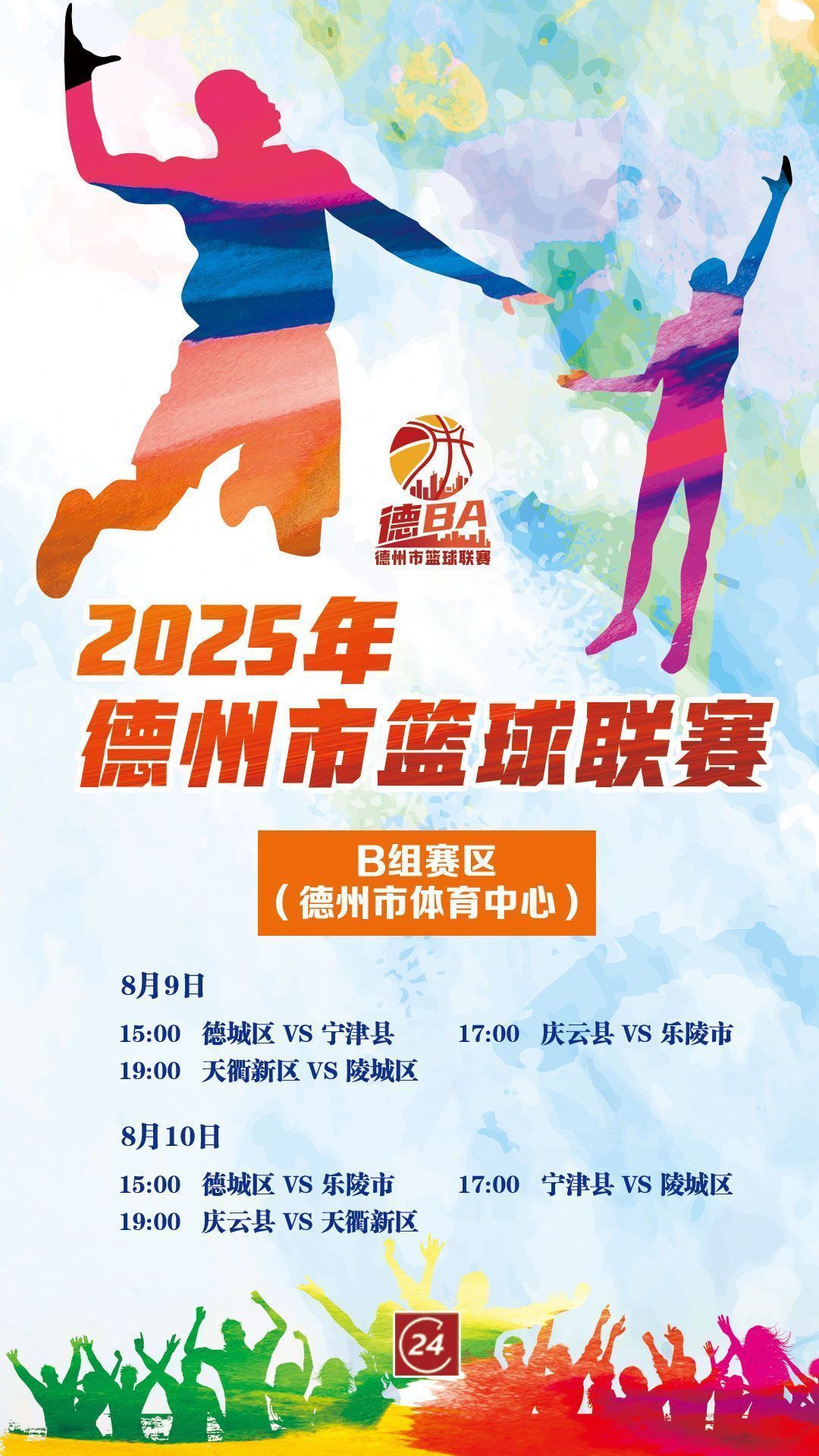 德报直播 | 8月10日德BA(B组赛区)开赛!德城VS乐陵;宁津VS陵城;庆云VS天衢新区 2025-08-10 09:36 德州日报 0 (点击图片观看直播) 8月10日,“德BA”B组赛区——德州市体育中心开赛。15时,德城区对阵乐陵市。17时,宁津县对阵陵城区。19时,庆云县对阵天衢新区。(A组赛区——平原县体育馆的赛事直播请关注德州日报抖音号、头条号平台观看) 德州日报新媒体出品编辑|王子梁辰审核|张晓航 终审|朱代军