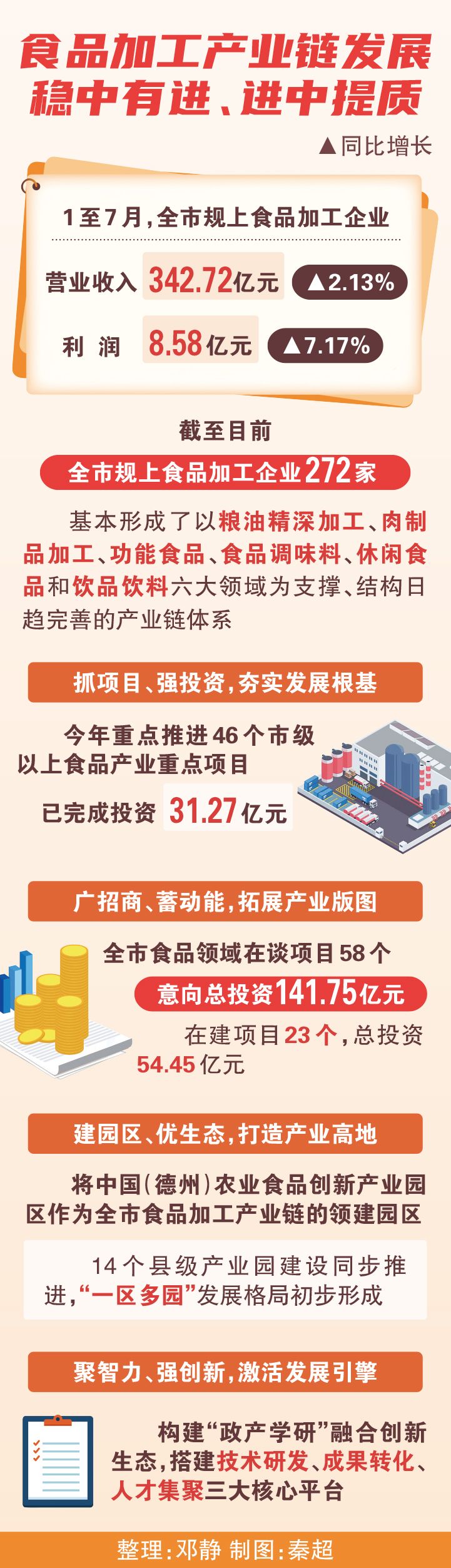 通过持续抓招商、上项目、育产业,德州形成以粮油精深加工、肉制品加工、功能食品、食品调味料、休闲食品和饮品饮料六大领域为支撑、结构日趋完善的产业链体系。小麦、玉米、大豆、肉制品、乳制品、辣椒等重点领域基本实现了全产业链发展。