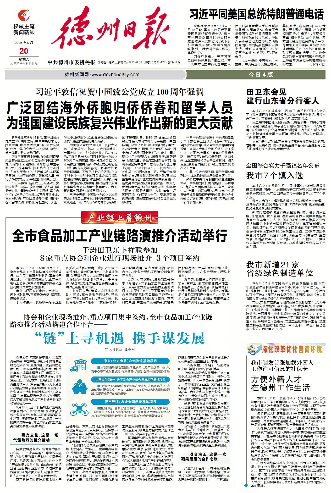 9月19日,全市食品加工产业链路演推介活动在中国(德州)农业食品创新产业园举行,聚焦“从田间到餐桌”各个环节, 搭建集技术、市场、供应于一体的高效对接平台,为全市食品加工产业高质量发展注入强劲动能。