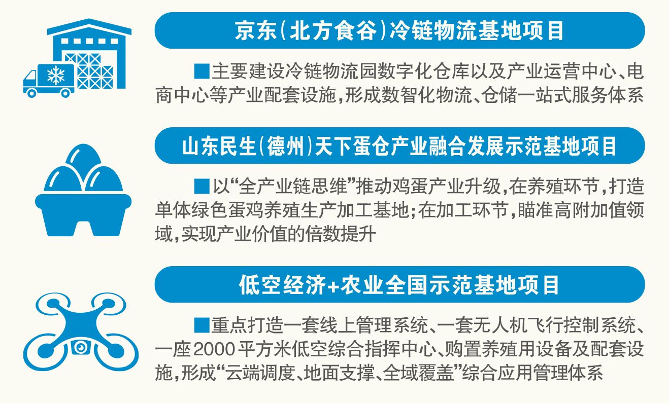 活动中,京东(北方食谷)冷链物流基地项目、山东民生(德州)天下蛋仓产业融合发展示范基地项目、低空经济+农业全国示范基地3个项目集中签约,为我市食品加工产业延链补链强链按下“加速键”,为区域高质量发展增添新活力、积蓄新势能。