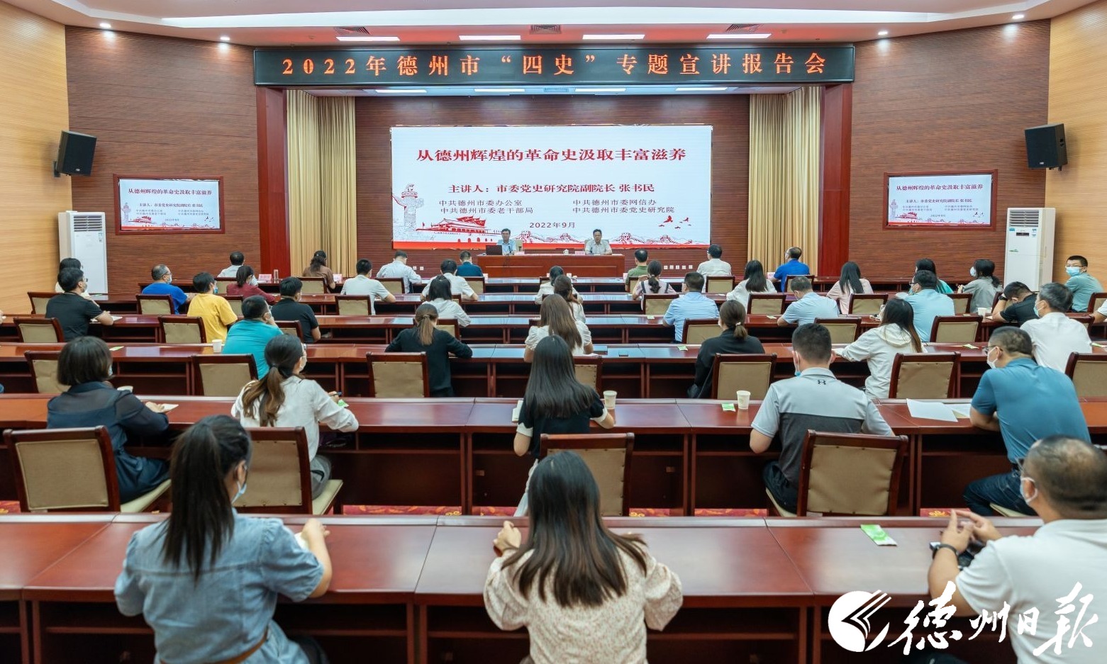 为巩固拓展党史学习教育成果,建立常态化长效化制度机制,教育引导广大党员、干部把学党史、用党史作为终身必修课,不断坚定历史自信、增强政治自觉,弘扬伟大建党精神,9月9日,2022年德州市“四史”专题宣讲报告会举行,邀请市委党史研究院副院长张书民作宣讲报告,来自市委办公室、市委网信办、市委老干部局、市委党史研究院约80余人参加。
