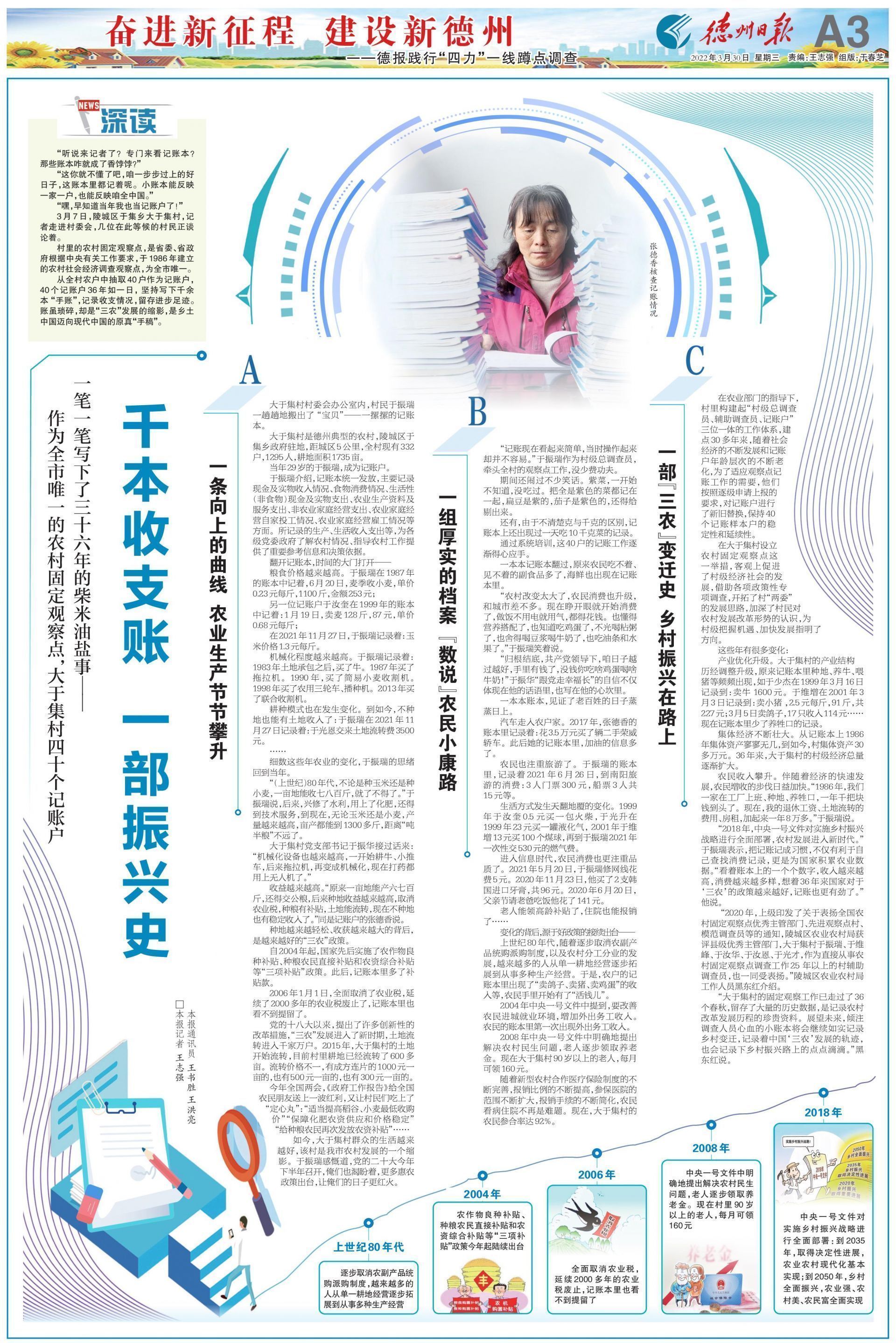 今年3月30日,本报《奋进新征程 建设新德州——德报践行“四力”一线蹲点调查 深读》栏目以《作为全市唯一的农村固定观察点,大于集村40个记账户一笔一笔写下了36年的柴米油盐事——千本收支账 一部振兴史》为题,通过一条向上的曲线农业生产节节攀升、一组厚实的档案“数说”农民小康路、一部“三农”变迁史乡村振兴在路上三个方面,报道了该村小账本反映时代大发展的故事。