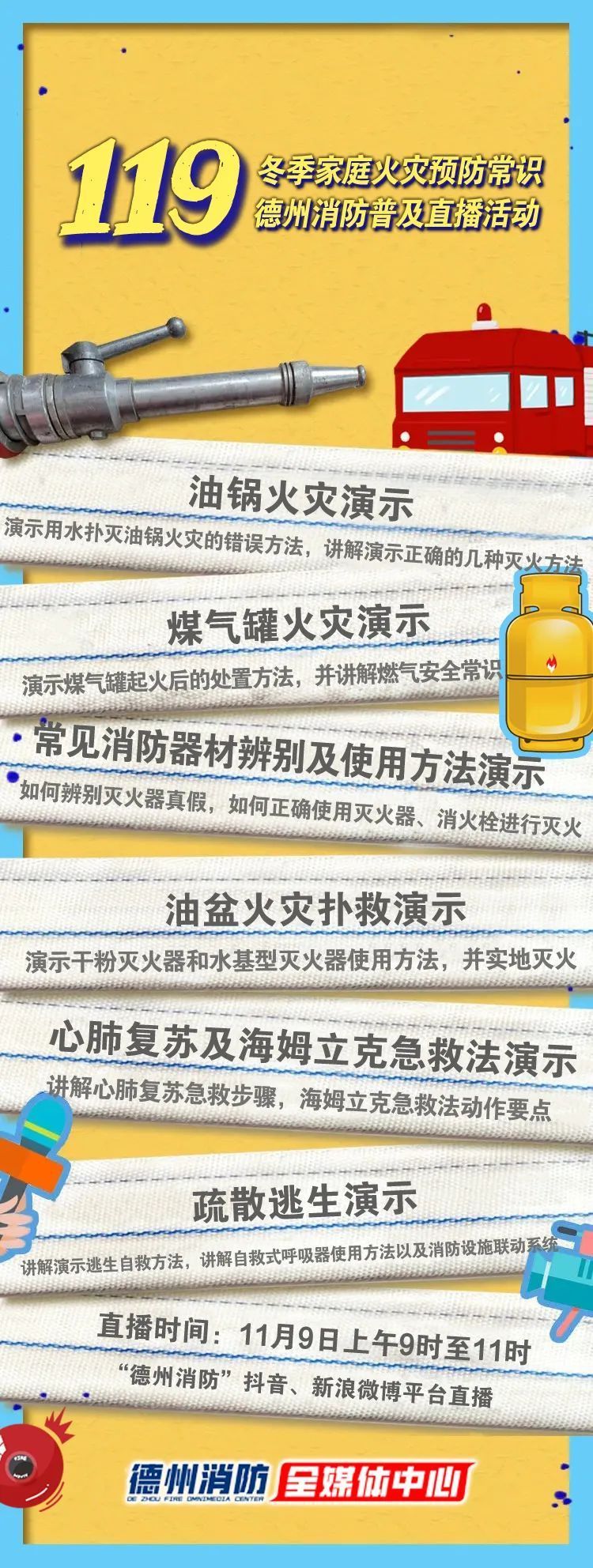 德报直播 | 德州消防“119全国消防日”直播活动 2022-11-08 20:42 德州日报 0 ▲点击图片观看直播 2022年11月是山东省第12个法定消防安全宣传月,今年宣传月主题为“抓消防安全、保高质量发展”。为切实提升公众自防自救能力,普及消防安全常识,结合疫情防控形势,德州消防在“‘119’全国消防日”开展冬季家庭火灾预防常识普及直播活动。 德报融媒体对活动进行全程直播,敬请关注! 德州日报新媒体出品编辑|王琳审核|张晓航 终审|朱代军