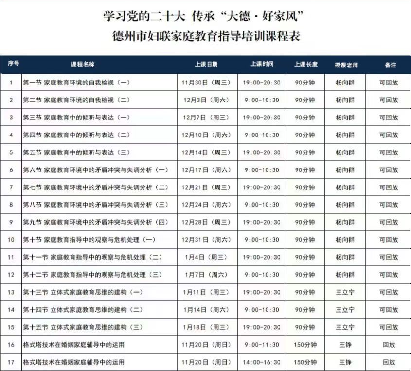 每周三晚上19:00-20:30,周六上午9:00-10:30,不见不散!凡是完成线上17节课程学习的家长还有额外奖励!只要按时完成17课时的学习,课堂笔记字数不少于5000字,市妇联将颁发家庭教育指导培训学习证书,并有机会参加为期4天的线下指导培训。