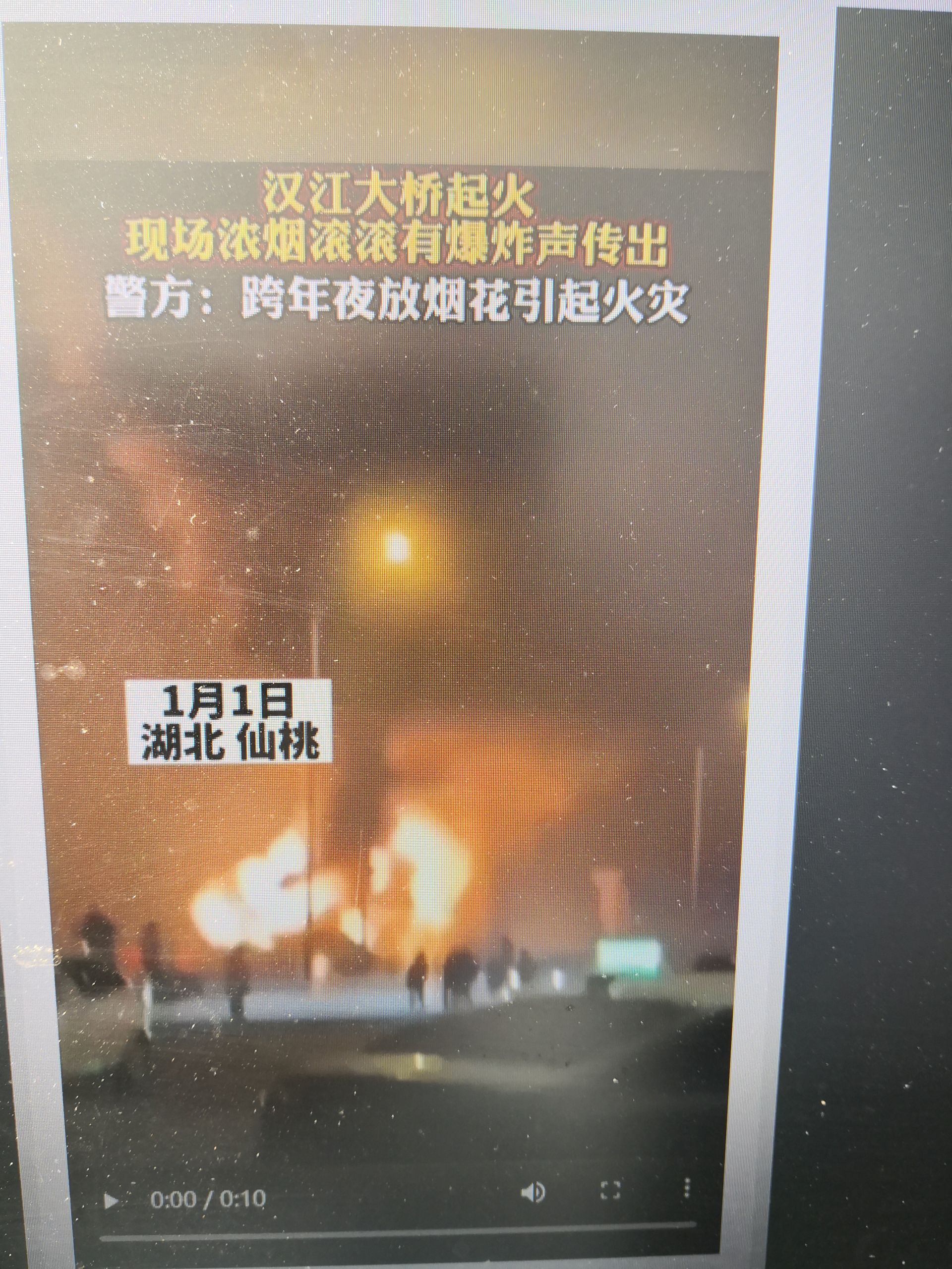 湖北汉江大桥“跨年夜”电缆起火,警方:放烟花引起 2023-01-02 11:19 0 2023年1月1日,湖北汉江大桥附近发生火灾。凌晨时分大桥下浓烟滚滚,还有燃爆声传出,一些电缆线被引燃。警方调查后表示,火灾是跨年的人燃放烟花引起,消防员已经扑灭了大火,没有人员伤亡。 德州日报融媒体出品 编辑、审核 | 张志宁 终审 | 杨德林