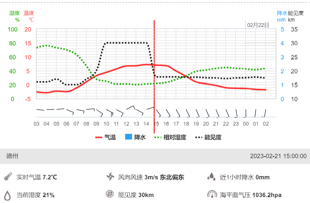 22日夜间晴,南风3级,最低气温-1℃;23日白天多云,南风3级,最高气温11℃。