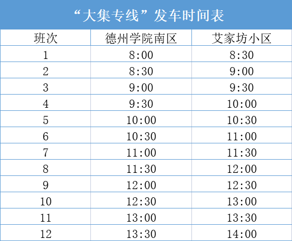 运行时间:艾家坊大集专线定于4月15日开通试运营,农历逢四、九和每周六8:00—13:00运营,运营间隔30分钟。