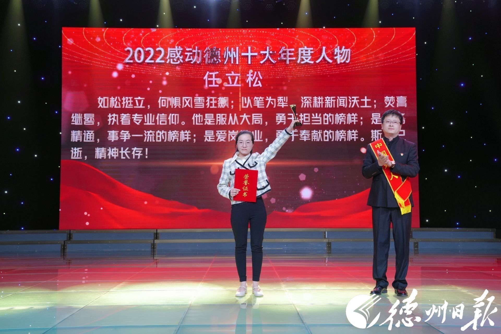 △2022感动德州十大年度人物颁奖典礼现场,任立松的妻子姜小艳高举奖杯