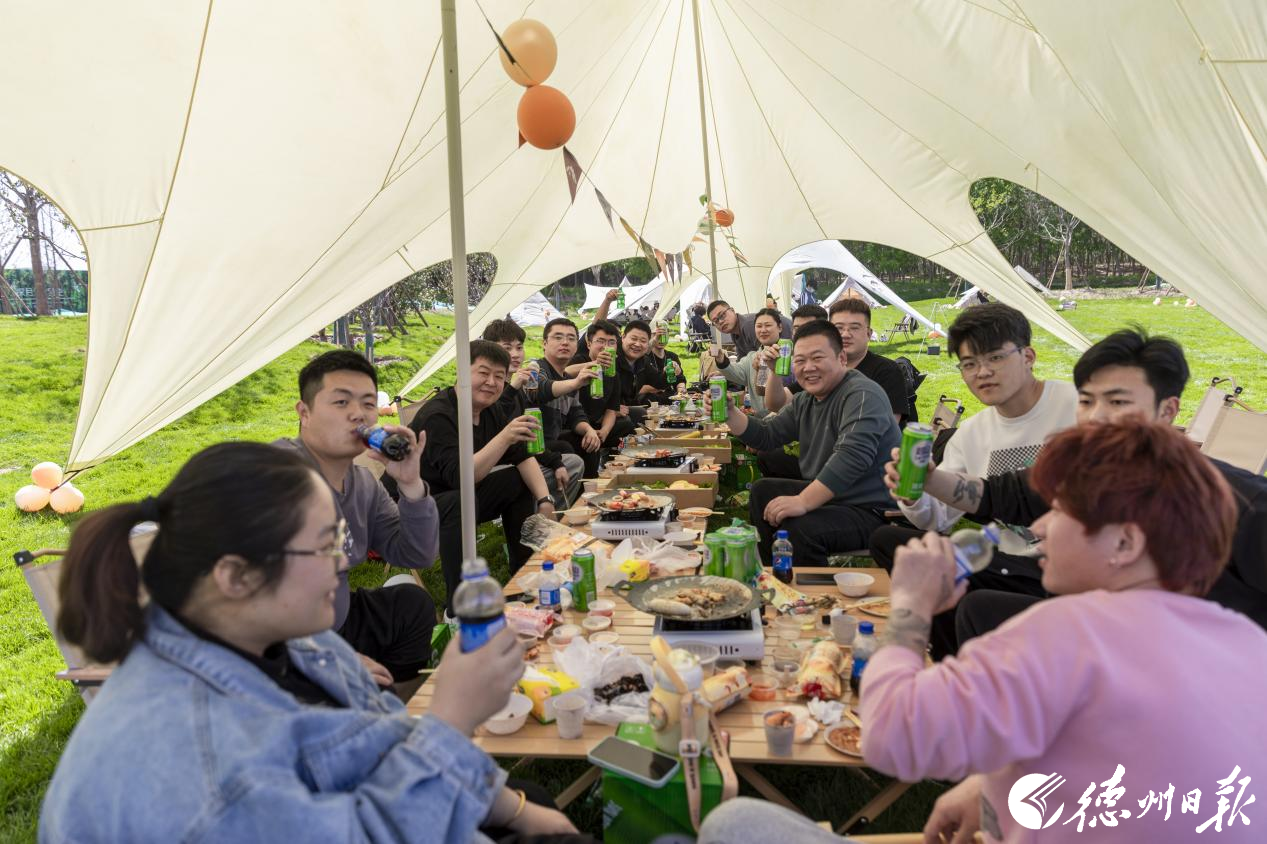在露营地,一顶顶帐篷、一块块野餐垫、一把把露营椅被摆放在草坪上,孩子们肆意地奔跑,年轻情侣彼此倚靠,三五好友分享着美食,充满欢声笑语。