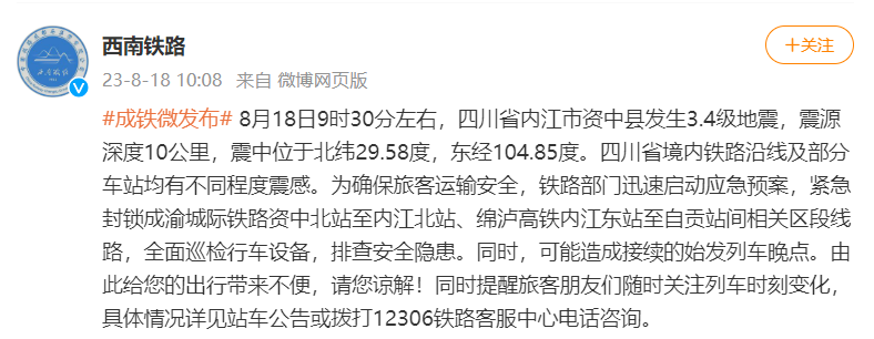 8月18日10时08分,西南铁路官方微博发布消息,称受地震影响,四川省境内铁路沿线及部分车站均有不同程度震感。