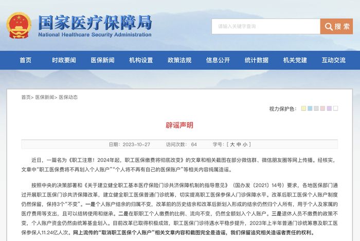 近日,一篇名为《职工注意!2024年起,职工医保缴费将彻底改变》的文章和相关截图在部分微信群、微信朋友圈等网上传播。经核实,文章中“职工医保费将不再划入个人账户”“个人将不再有自己的医保账户”等相关内容纯属造谣。