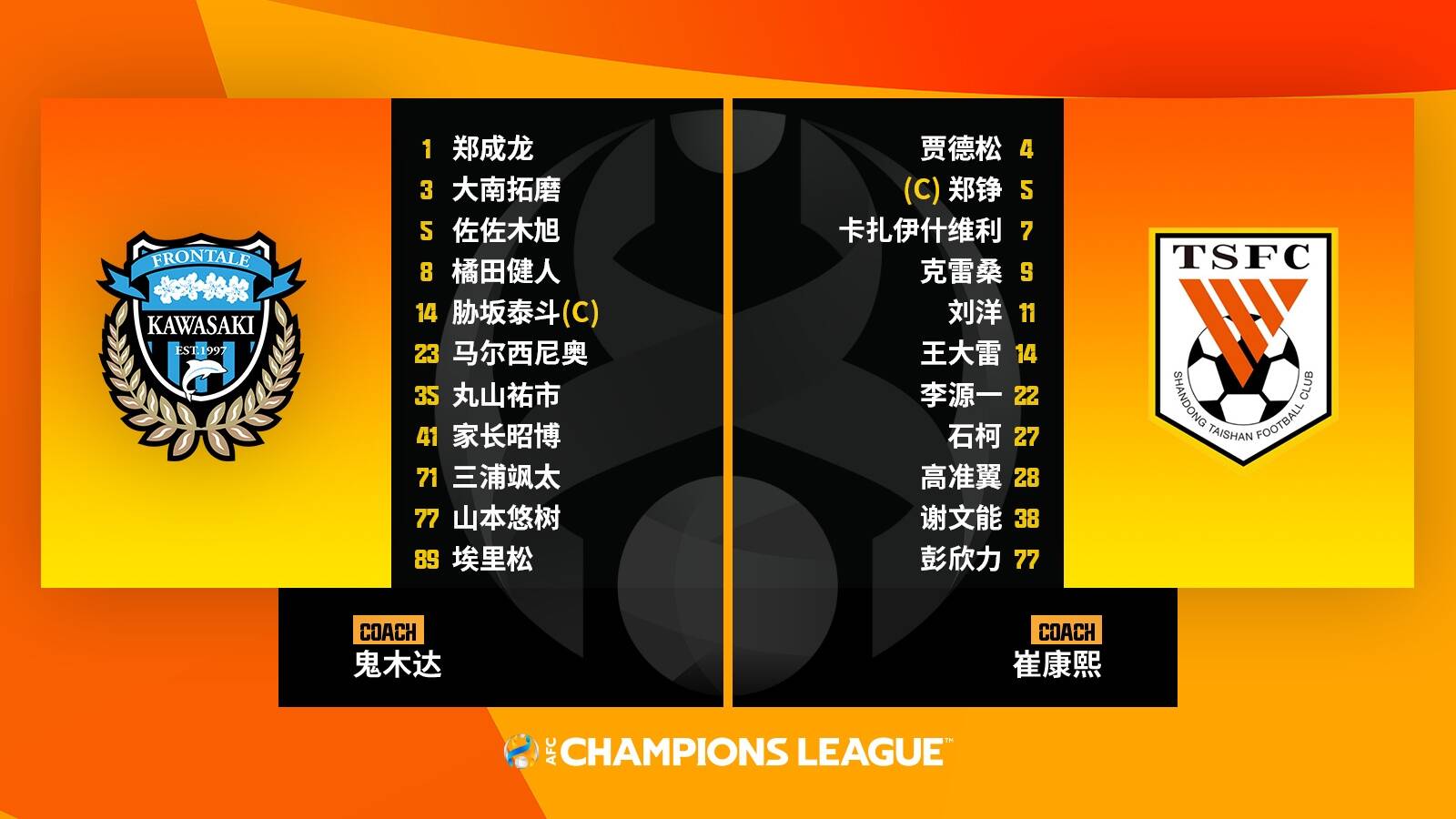 川崎前锋首发:1-郑成龙、3-大南拓磨、5-佐佐木旭、35-丸山佑市、71-三浦飒太、8-橘田健人、14-胁坂泰斗、77-山本悠树、23-马尔西尼奥、41-家长昭博、89-埃里松