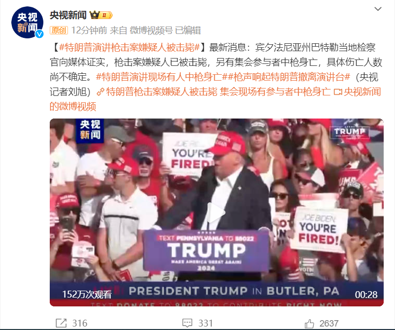 当地时间13日下午,特朗普在美国宾夕法尼亚州举行竞选集会发表演讲时,现场响起枪声。他在特勤人员保护下立即撤离了演讲台。枪击案现场一名犯罪嫌疑人已经被特勤局人员控制。宾夕法尼亚州巴特勒当地检察官向媒体证实,枪击案嫌疑人已被击毙,另有集会参与者中枪身亡,具体伤亡人数尚不确定。