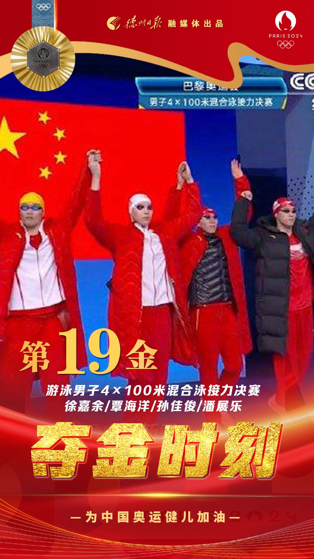 金牌+1!中国队夺得男子4×100米混合泳接力金牌 2024-08-05 01:20 央视新闻 0 北京时间8月5日,在巴黎奥运会游泳男子4×100米混合泳接力决赛中,中国队夺得金牌。这是中国代表团在本届奥运会上获得的第19枚金牌。 德州日报新媒体出品来源|央视新闻 编辑|密霖审核|张晓航 终审|朱代军