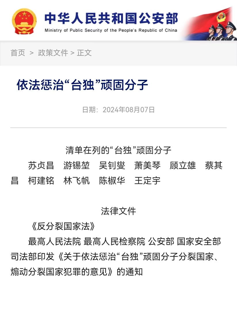8月7日,国务院台办网站新增了“依法惩治‘台独’顽固分子”专栏。公安部政府网站也新增了“依法惩治‘台独’顽固分子”专栏。