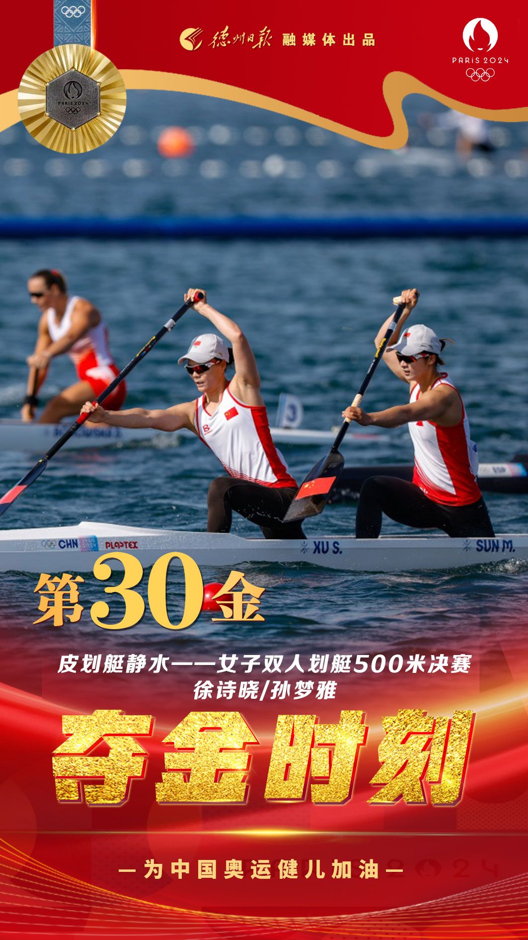 徐诗晓、孙梦雅,拿下第30金! 2024-08-09 19:07 新华社 0 在刚刚结束的巴黎奥运会皮划艇静水项目女子双人划艇500米决赛中,中国选手徐诗晓、孙梦雅夺得金牌。 德州日报新媒体出品来源|新华社 编辑|密霖审核|张晓航 终审|朱代军