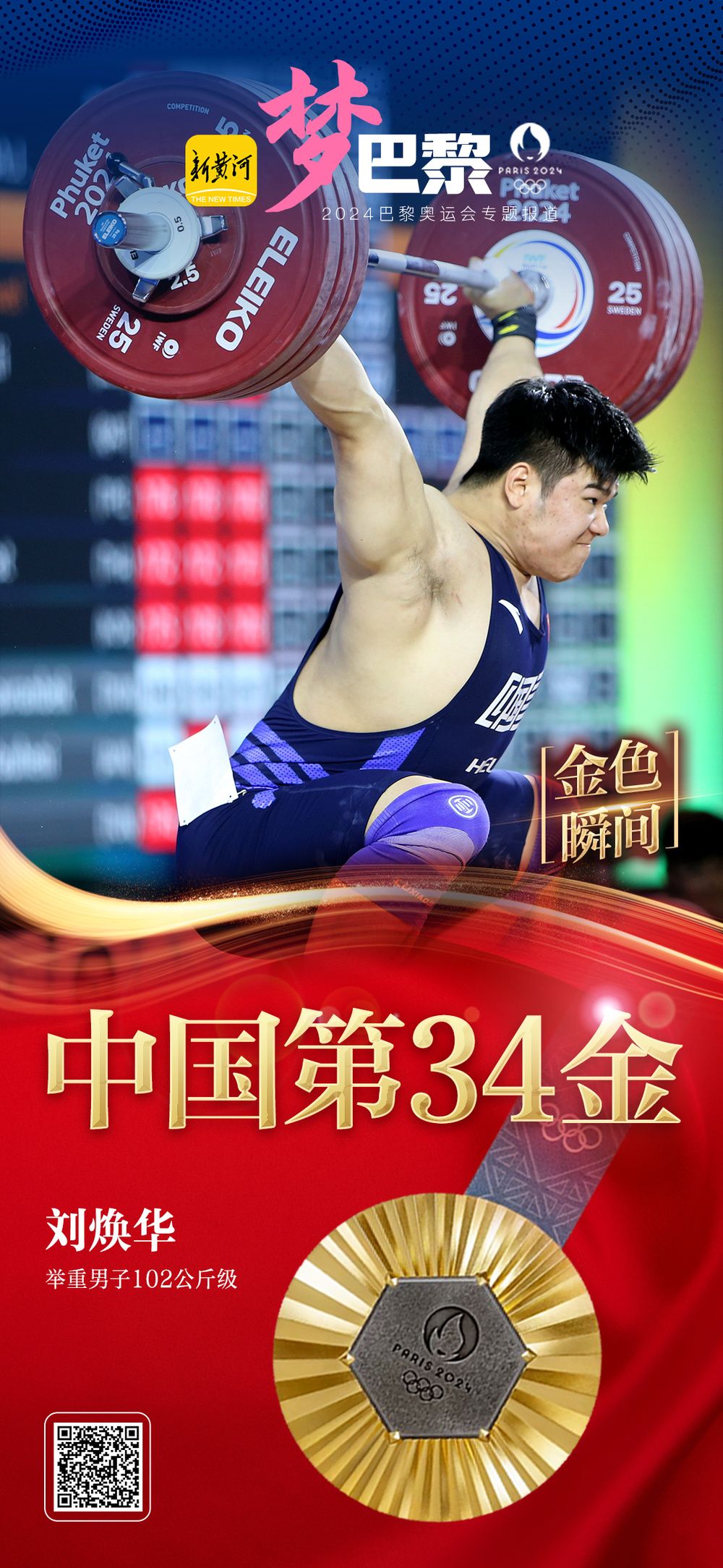 北京时间8月10日晚,巴黎奥运会举重男子102公斤级金牌赛,中国选手刘焕华以抓举186公斤、挺举220公斤,总成绩406公斤夺得冠军,为中国代表团摘得第34枚金牌。