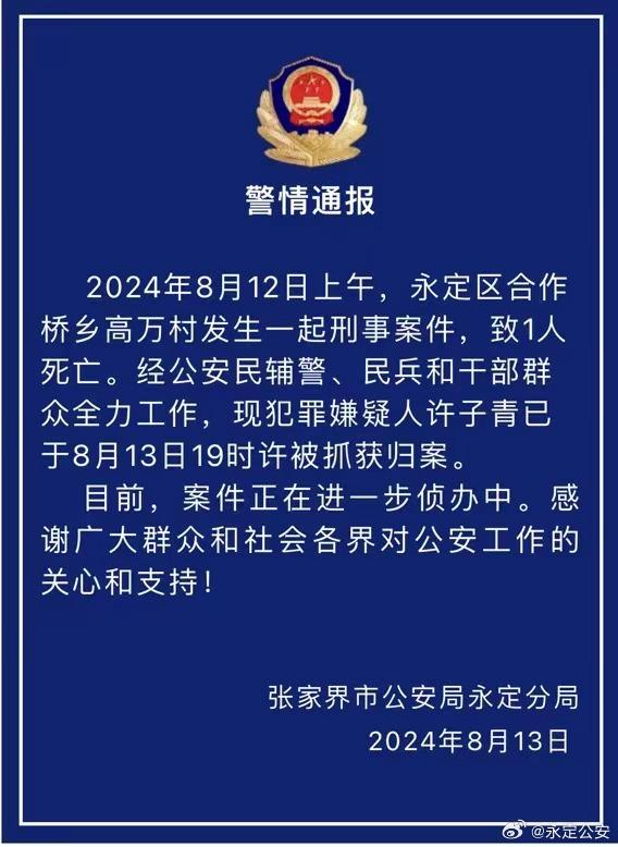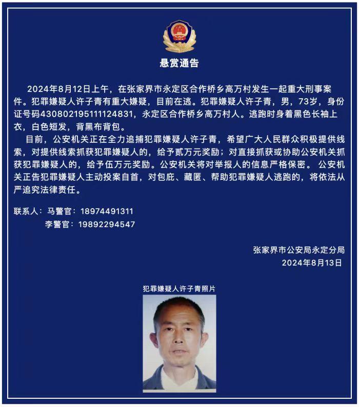 湖南张家界重大刑案73岁嫌犯已落网,此前警方曾发悬赏通告 2024-08-13 21:23 @永定公安 0 此前警方曾发悬赏通告»»» 德州日报新媒体出品来源|@永定公安 编辑|王琳审核|张晓航 终审|朱代军