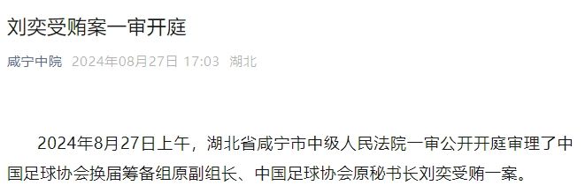 中国足球协会换届筹备组原副组长、中国足球协会原秘书长刘奕受贿案一审开庭 2024-08-27 17:11 新华社 0 2024年8月27日上午,湖北省咸宁市中级人民法院一审公开开庭审理了中国足球协会换届筹备组原副组长、中国足球协会原秘书长刘奕受贿一案。 微信公众号截图