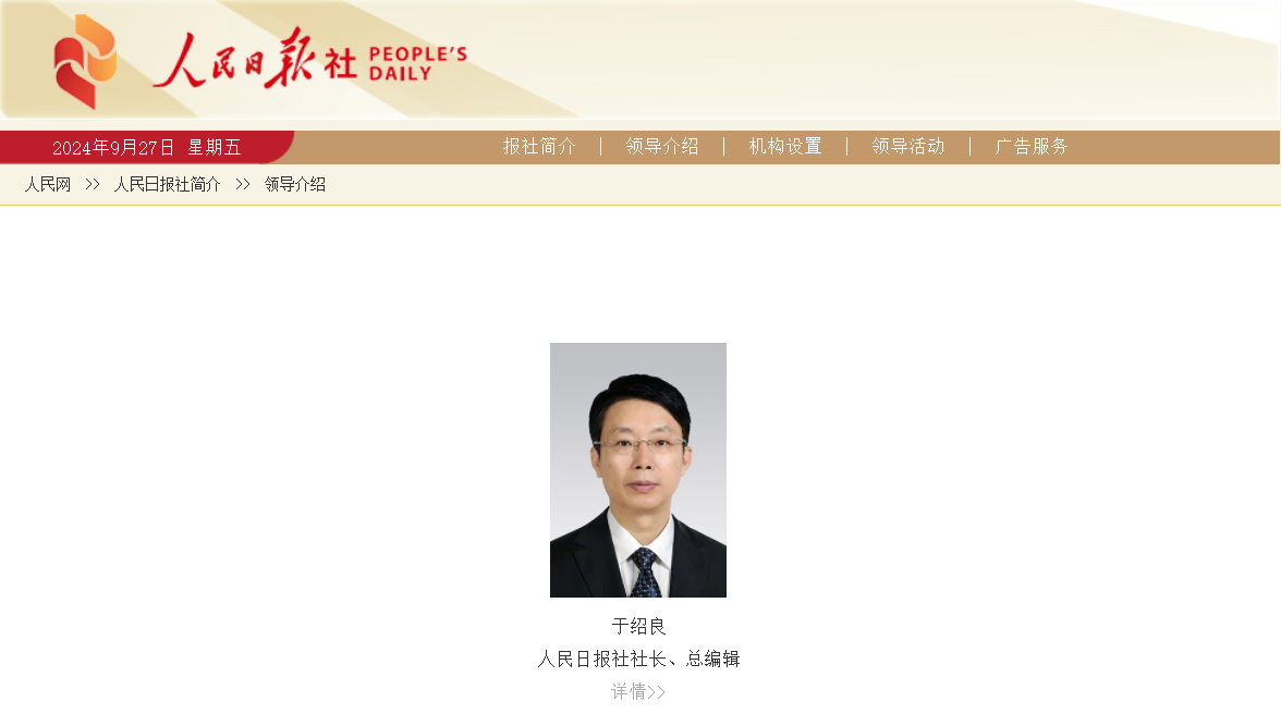 于绍良已任人民日报社社长、总编辑 2024-09-27 21:10 人民日报 0 人民日报社官网信息显示,于绍良已任人民日报社社长、总编辑。此前,人民日报社社长一职由庹震担任。 于绍良,男,汉族,1964年7月生,大学学历,中共党员,现任人民日报社社长、总编辑。