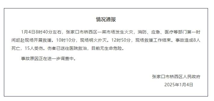 总台央视记者获悉,今天8时40分左右,河北张家口市桥西区一菜市场发生火灾。当地消防部门接警后,迅速前往现场扑救,上午10点多明火扑灭。12时50分,现场救援工作结束。事故造成8人遇难15人受伤,伤者已送往医院救治,目前无生命危险。