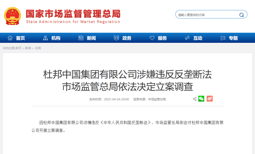 杜邦中国集团有限公司涉嫌违反反垄断法 市场监管总局依法决定立案调查 2025-04-04 20:06 市场监管总局网站 0 因杜邦中国集团有限公司涉嫌违反《中华人民共和国反垄断法》,市场监管总局依法对杜邦中国集团有限公司开展立案调查。
