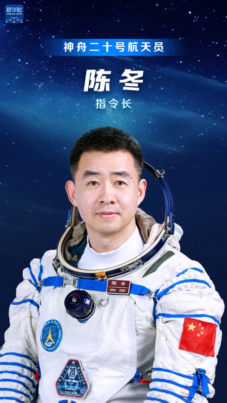 陈冬,男,汉族,籍贯河南郑州,河南洛阳出生,硕士学位。1978年12月出生,1997年8月入伍,1999年4月加入中国共产党,现为中国人民解放军航天员大队大队长、特级航天员,陆军大校军衔。曾任空军某师某团飞行大队大队长,被评为空军一级飞行员。2010年5月入选为我国第二批航天员。2016年10月,执行神舟十一号载人飞行任务,同年12月,被中共中央、国务院、中央军委授予“英雄航天员”荣誉称号,并获“三级航天功勋奖章”。2022年6月,执行神舟十四号载人飞行任务,2023年3月,被中共中央、国务院、中央军委授予“二级航天功勋奖章”。经全面考评,入选神舟二十号载人飞行任务乘组并担任指令长。