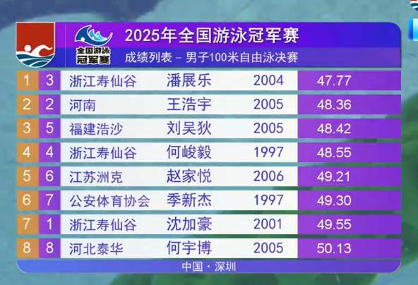 2025全国游泳冠军赛男子100米自由泳决赛,潘展乐以47秒77的成绩获得金牌!