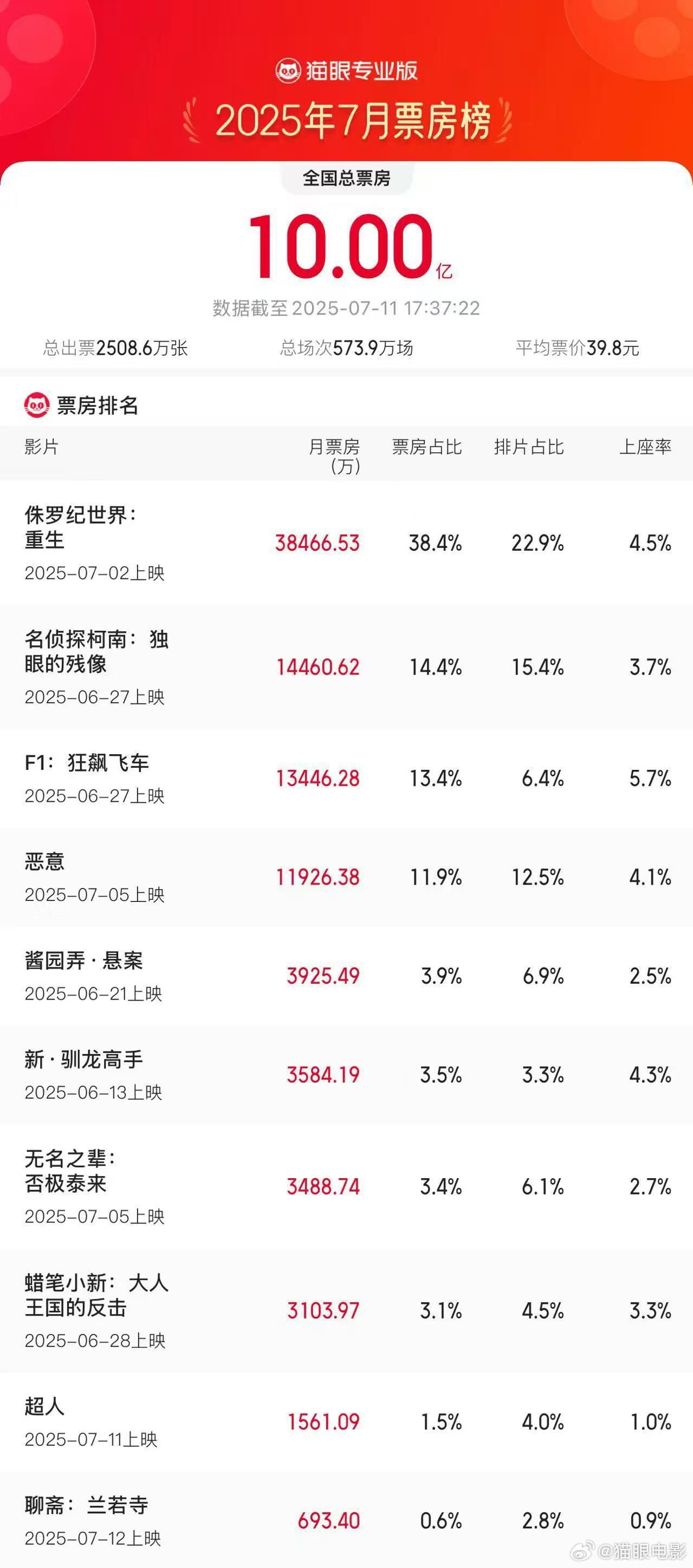 2025年7月电影总票房破10亿 2025-07-11 18:48 人民日报客户端 0 据猫眼专业版数据,7月11日17时37分,2025年7月总票房破10亿,《侏罗纪世界:重生》《名侦探柯南:独眼的残像》《F1:狂飙飞车》分列7月票房榜前三位。