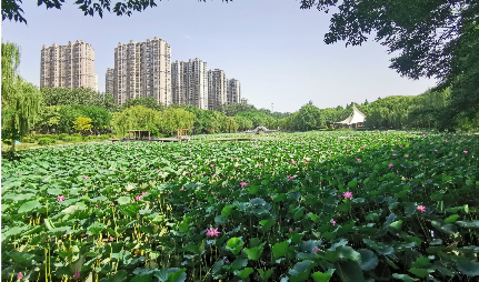 如今,荷塘周边树木葱茏,高楼林立,鸟语花香,姹紫嫣红,开放型的景区引得众多游人、客商和周边群众徜徉其中,用他们习惯了的健身方式醉心其里,生活在这里,仿佛是到了世外桃源。