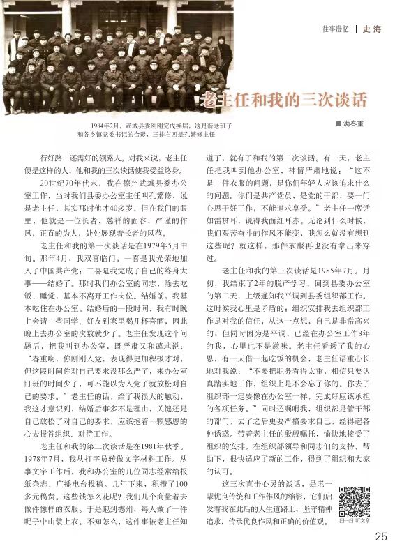 20世纪70年代末,我在德州武城县委办公室工作,当时我们县委办公室主任叫孔繁修,说是老主任,其实那时他才40多岁,但在我们的眼里,他就是一位长者,慈祥的面容,严谨的作风,正直的为人,处处展现着长者的风范。