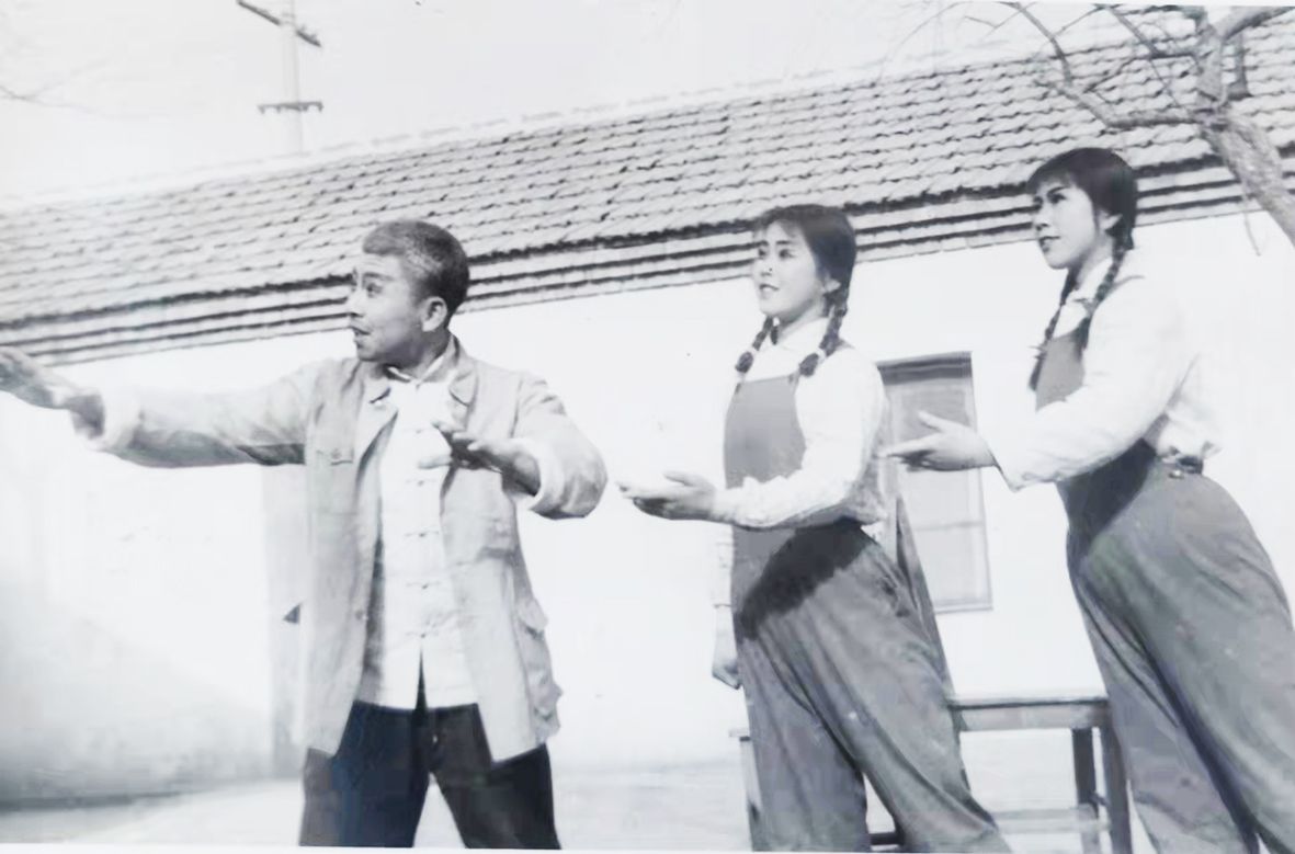 1971年,作者(左一)参加在平原县工业局院内的节目排练