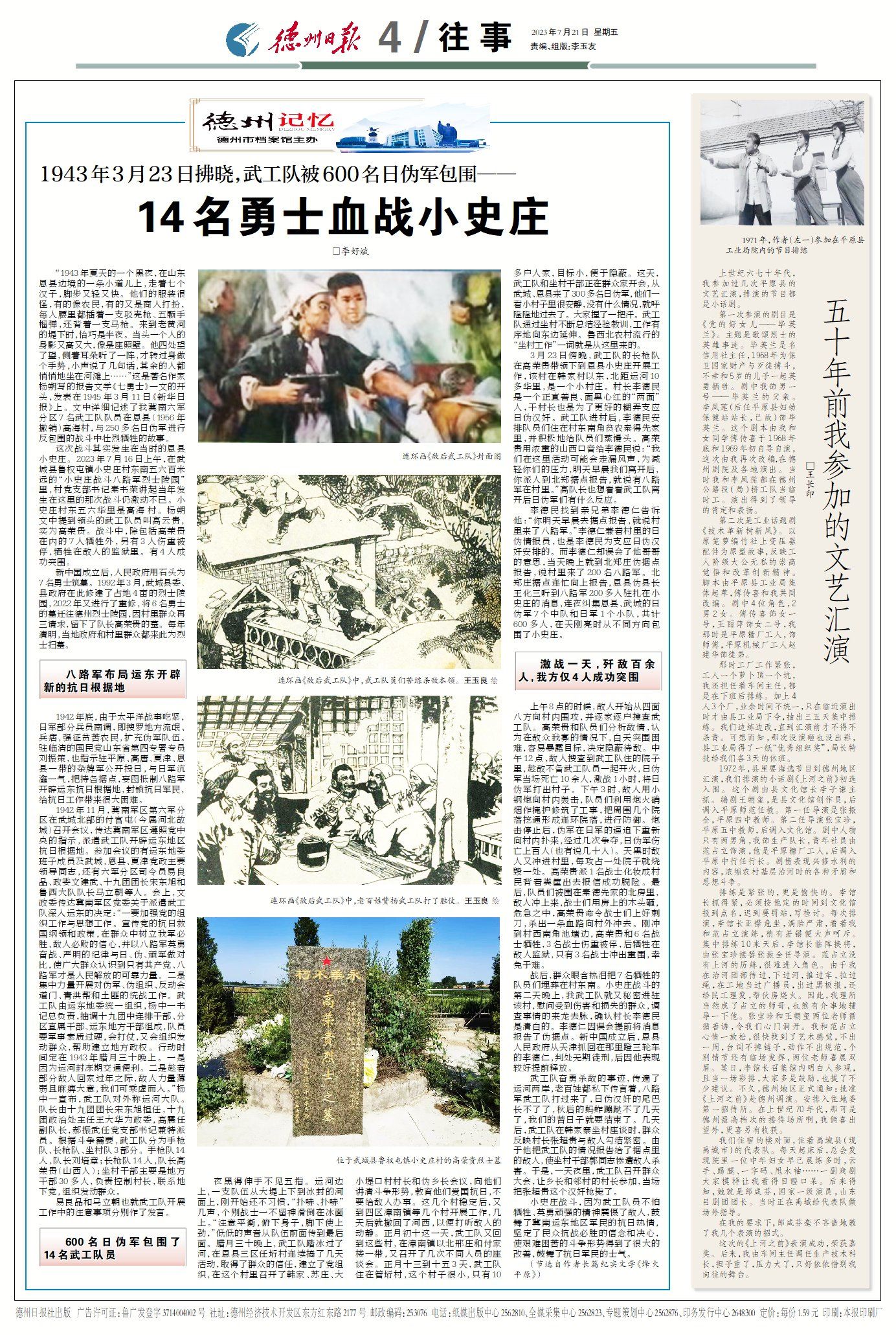 1972年,县里要海选节目到德州地区汇演,我们排演的小话剧《上河之前》初选入围。这个剧由县文化馆长李子谦主抓。编剧王朝玺,是县文化馆创作员,后调入平原师范任教。第一任导演是张振全,平原四中教师。第二任导演张宝珍,平原五中教师,后调入文化馆。剧中人物只有两男角,我饰生产队长,青年社员由范占立饰演,他是平原糖厂工人,后调入平原中行任行长。剧情表现兴修水利的内容,浓缩农村基层治河时的各种矛盾和思想斗争。