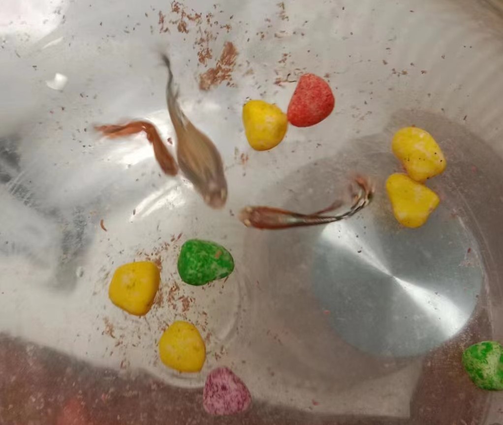 最后产下的这条幼鱼,生下来就迅速地贴着鱼缸四周的玻璃壁转圈,我用渔网捞竟没捞起来,正当我再次打捞时,它突然消失不见了,我担心它被大鱼一口吃掉,焦急地找了好久,突然发现这条幼鱼竟在两个小手指甲盖大小的彩色石头中间躲藏起来。