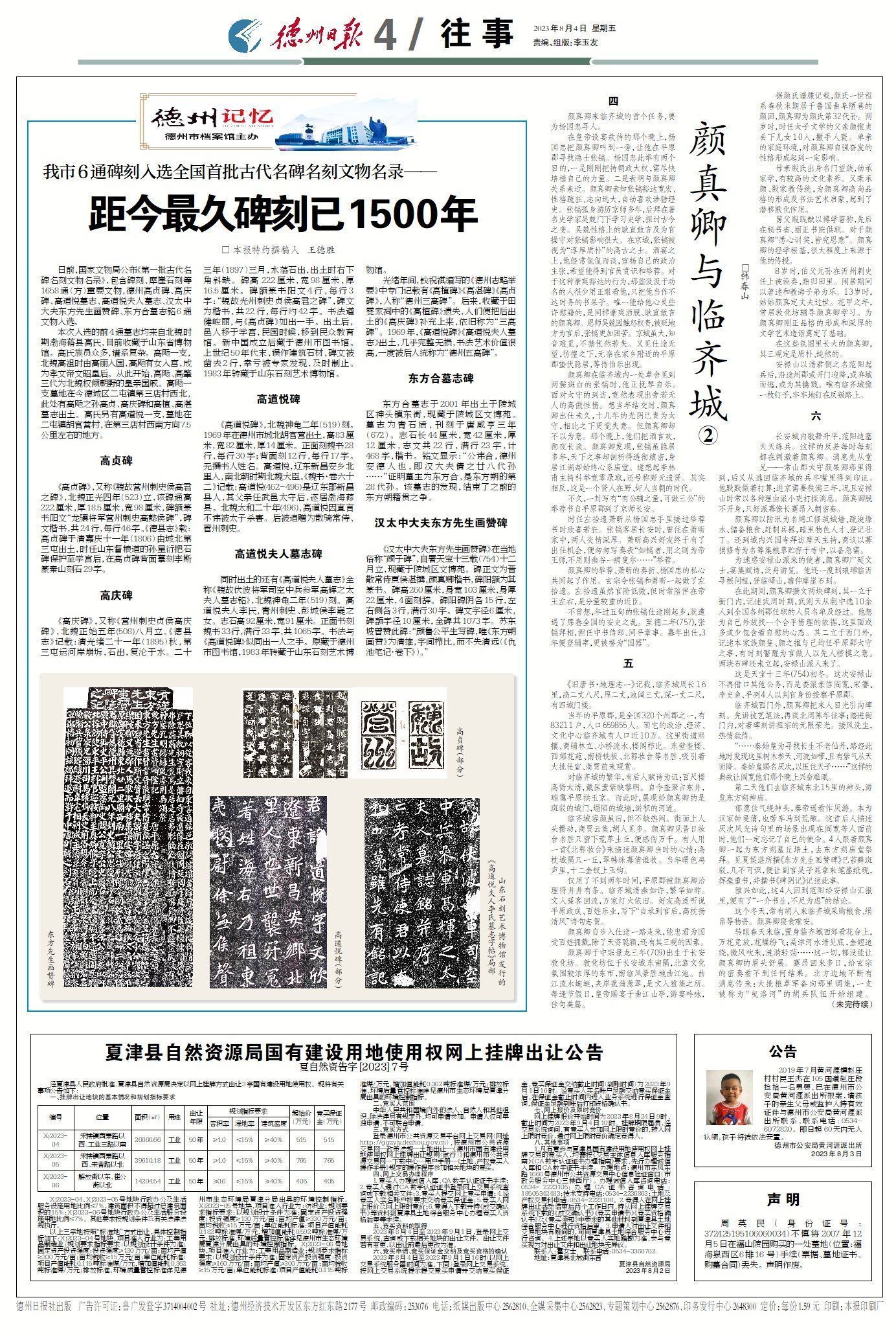 在此期间,颜真卿撰文两块碑刻,其一立于衙门内,记述武周时期,武则天从朝中选10余人到全国各州郡任职的人员名单及经过。他想为自己外放找一个合乎情理的依据,这里面或多或少包含着自慰的心态。其二立于西门外,记述本家族颜斐、颜之推与己均任平原郡太守之事,有时刻警醒为官做人以先人楷模之意。两块石碑还未立起,安禄山派人来了。