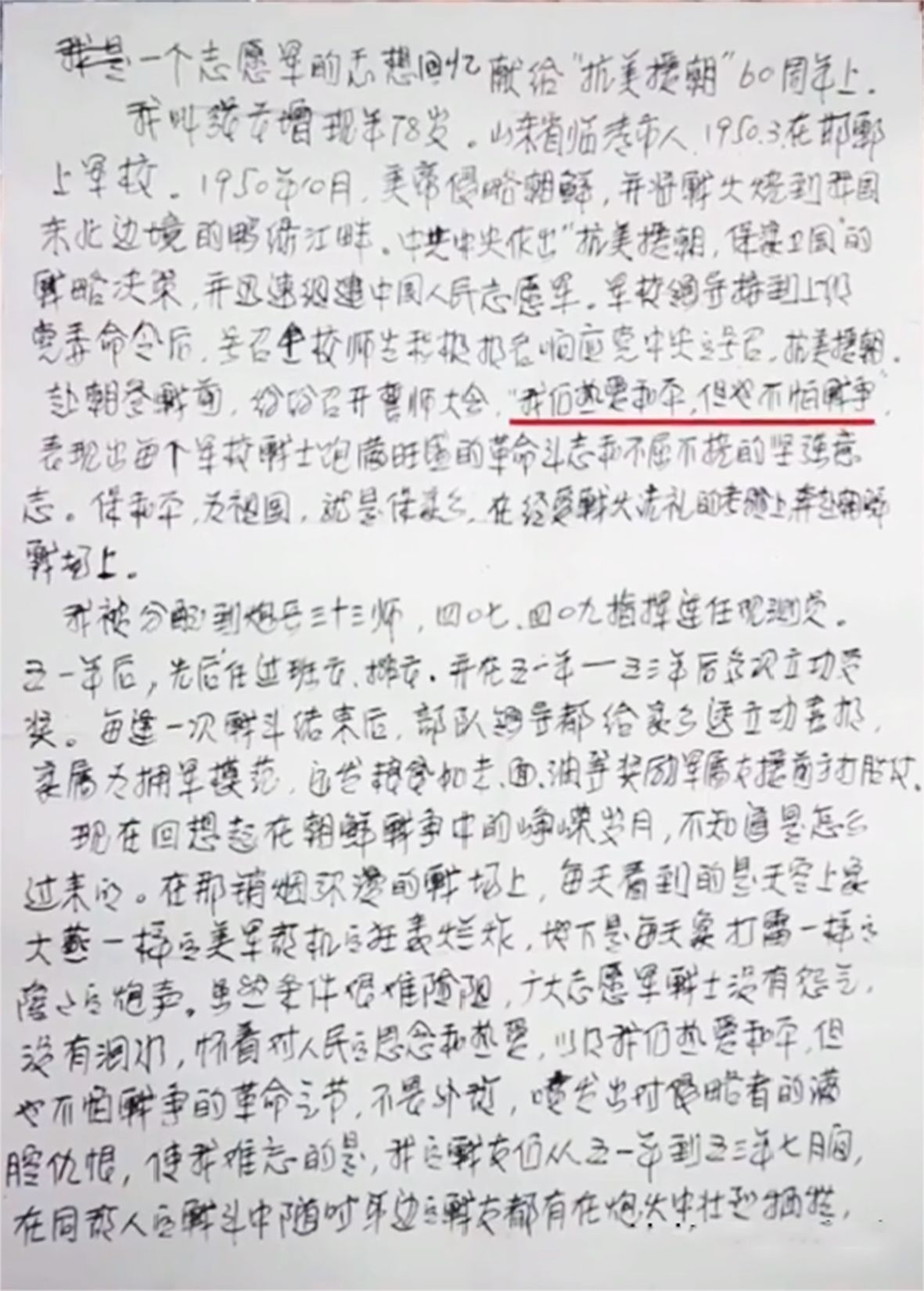 “我们热爱和平,但也不怕战争!”10年前,一位近80岁的老人手指颤抖着写下了这句话。这是抗美援朝老兵奋勇抗敌、保家卫国决心的最有力证明。如今时光荏苒,回忆录中的一字一句依然烙印着老人当年的光荣和自豪。这位老人就是张长增。他1932年出生,山东临清人,1950年奔赴朝鲜战场参加抗美援朝战争,1955年12月,由于战争中把耳朵震聋了,几经调动,最终被安排到德州汽运公司工作。