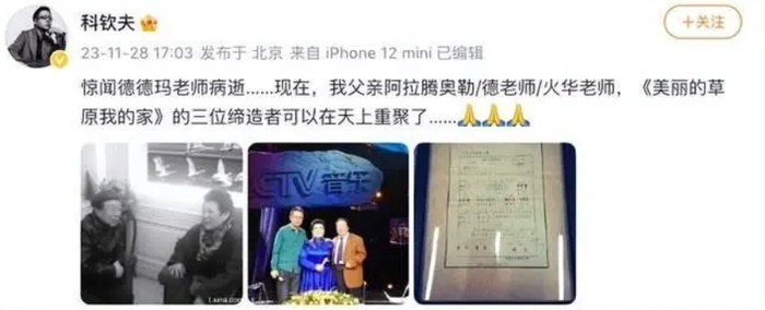 11月28日,音乐人@科钦夫 发文:“惊闻德德玛老师病逝……现在,我父亲阿拉腾奥勒/德老师/火华老师,《美丽的草原我的家》的三位缔造者可以在天上重聚了……”