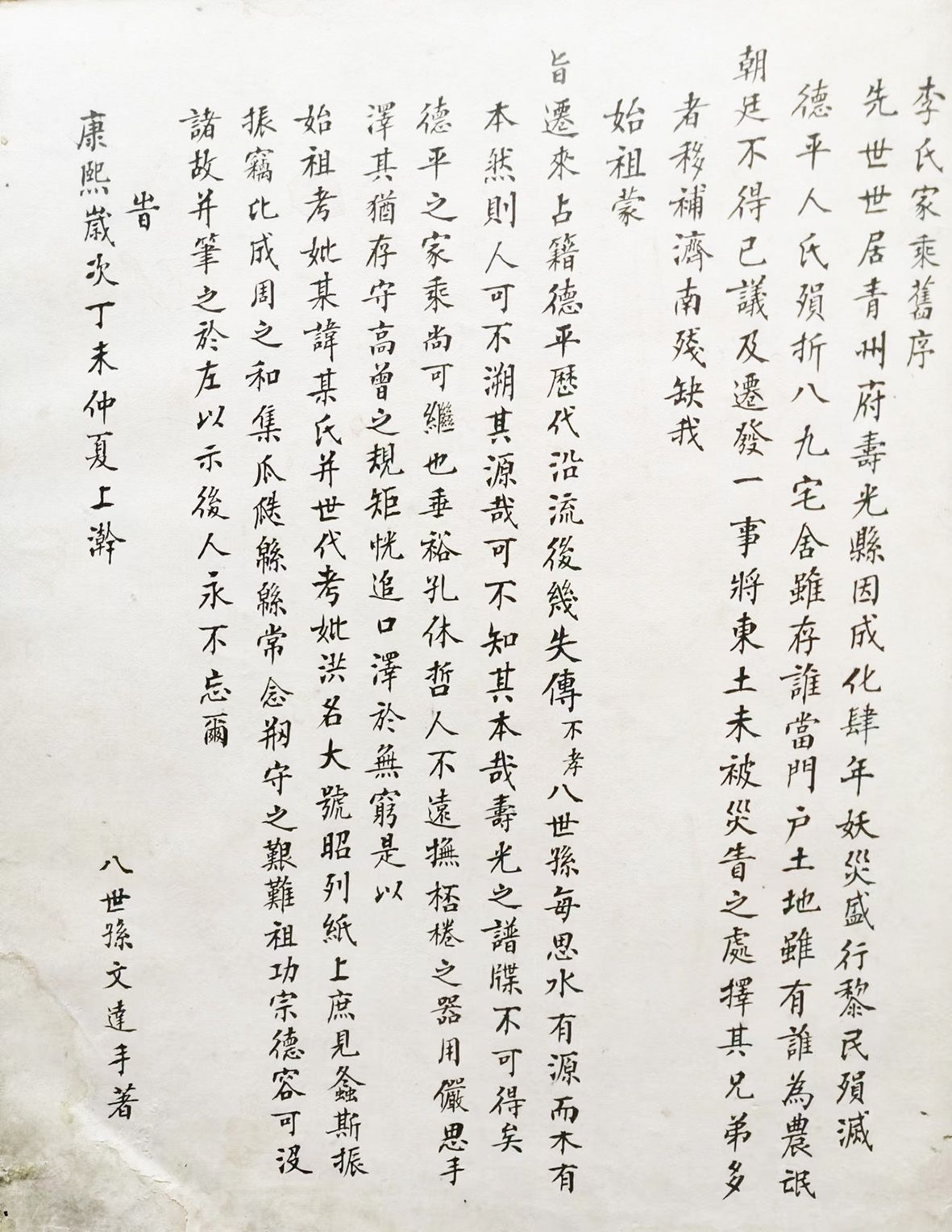 1946年农历正月,李氏家族李锦章、李汉章、李福生等三世十余人续修族谱,聘德平县前教育局局长赵汉青撰《李氏续修族谱序》、前教育委员赵乙青书序。